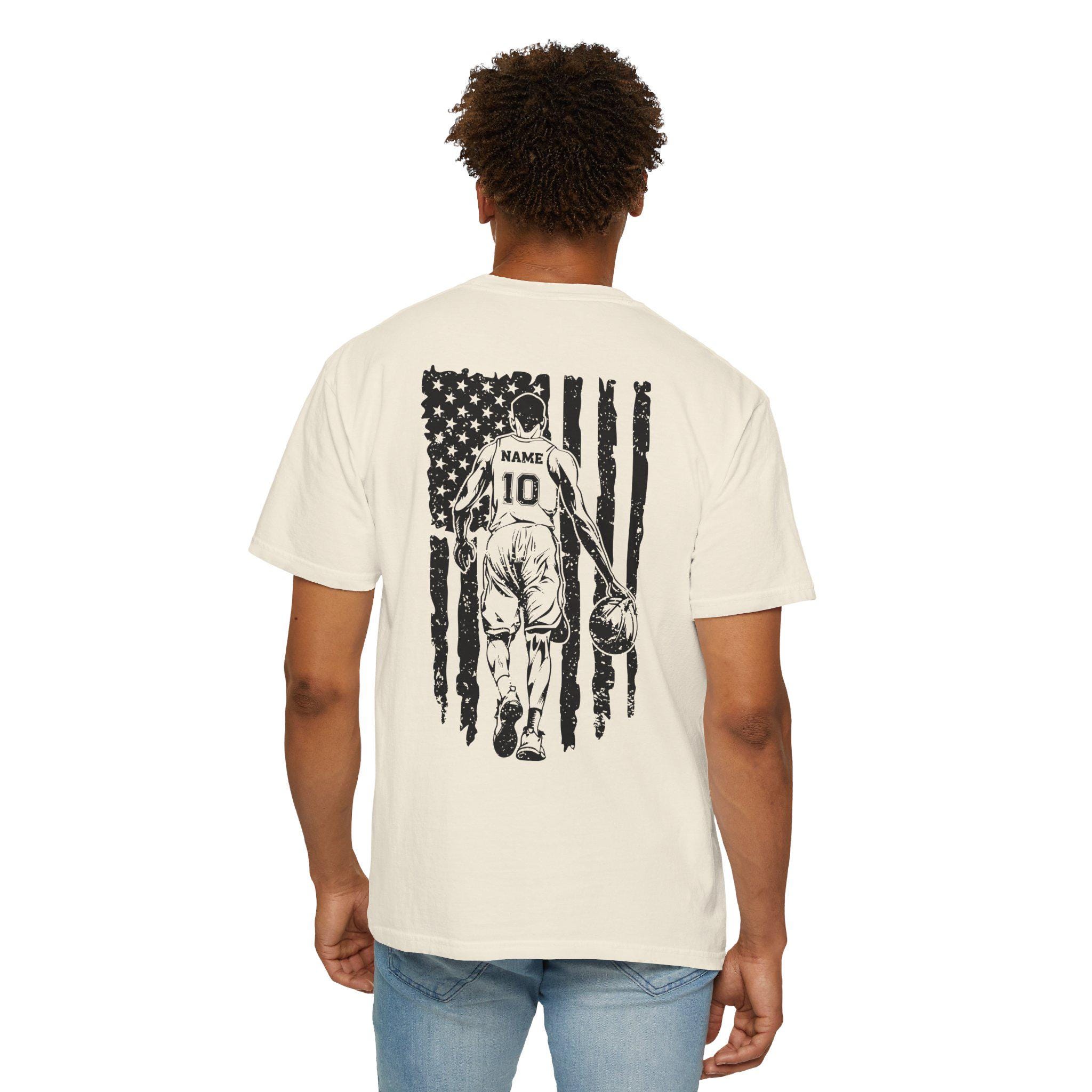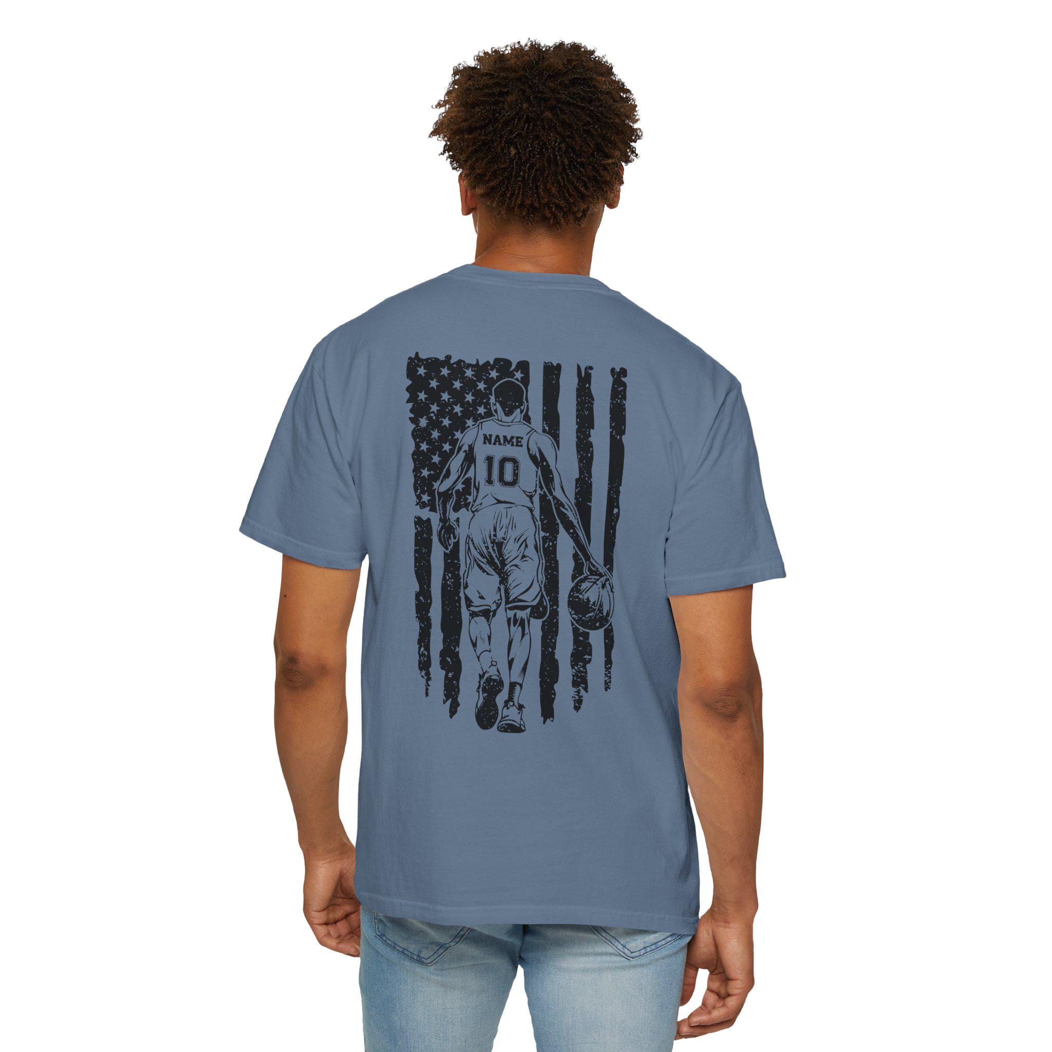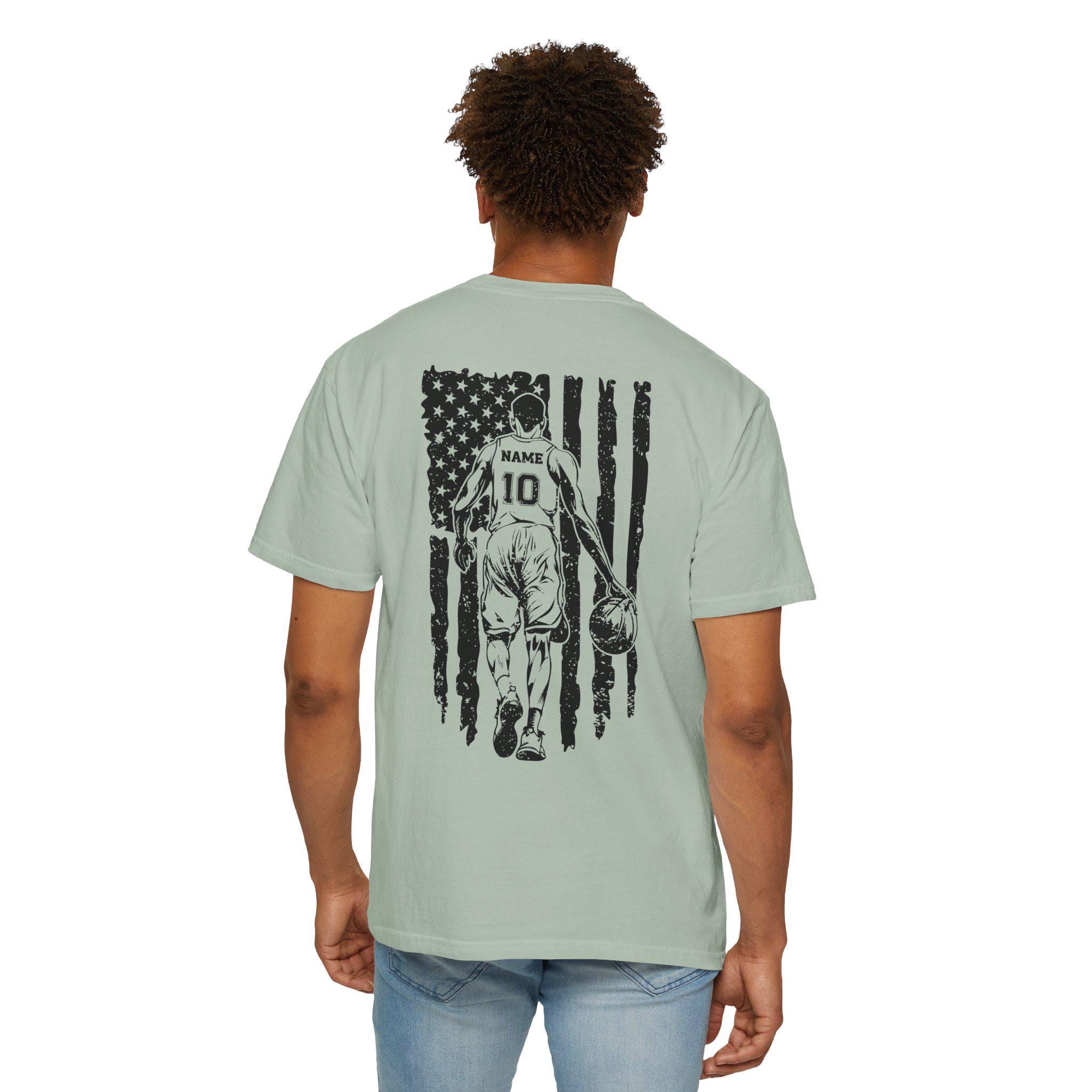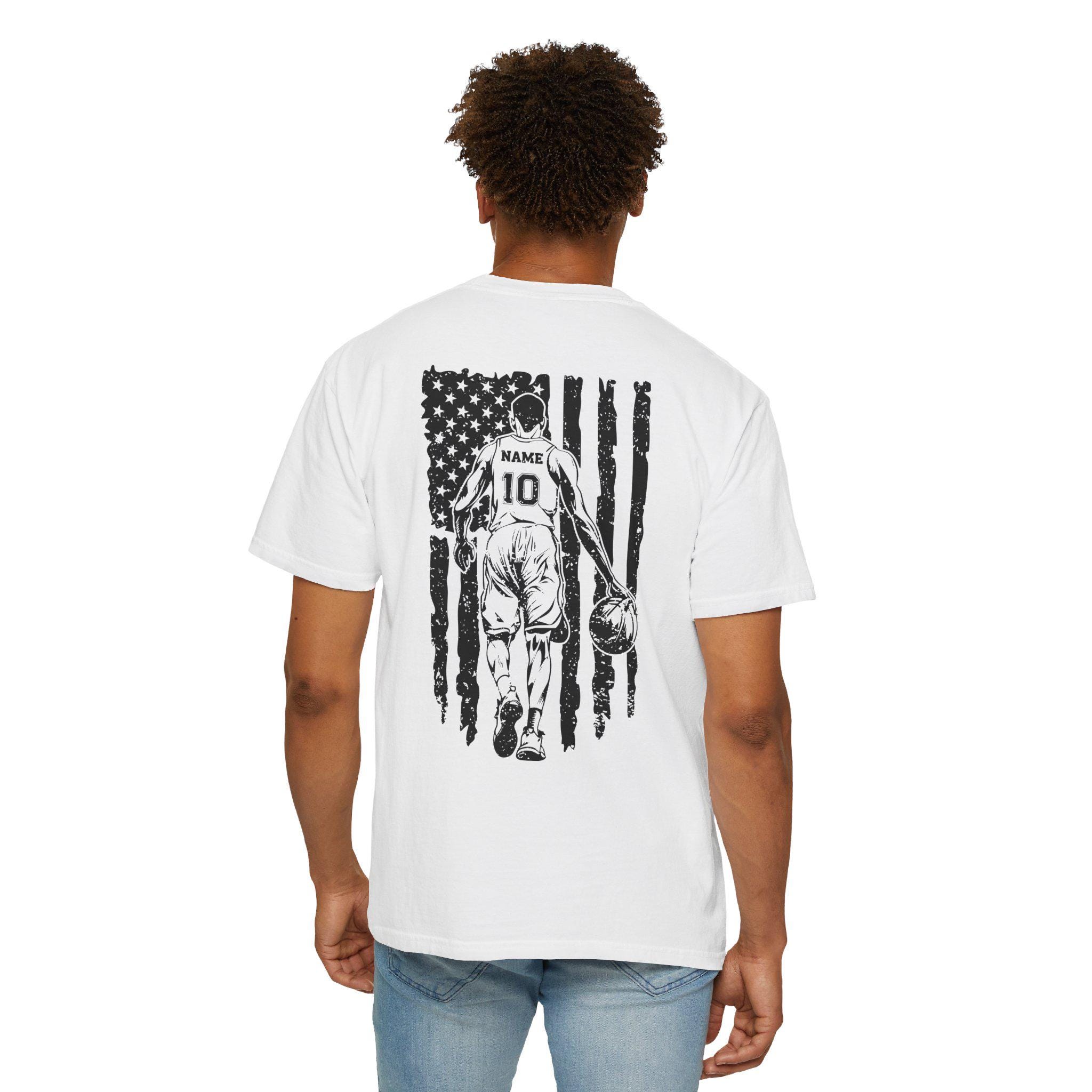 Make your basketball dad feel like the ultimate star with this custom player shirt featuring a distressed American flag design and player silhouette. This dad shirt is perfect as a basketball team uniform or simply as a stylish addition to any sports team apparel collection, customizable with your preferred name and number for a truly personalized dad sports gift.