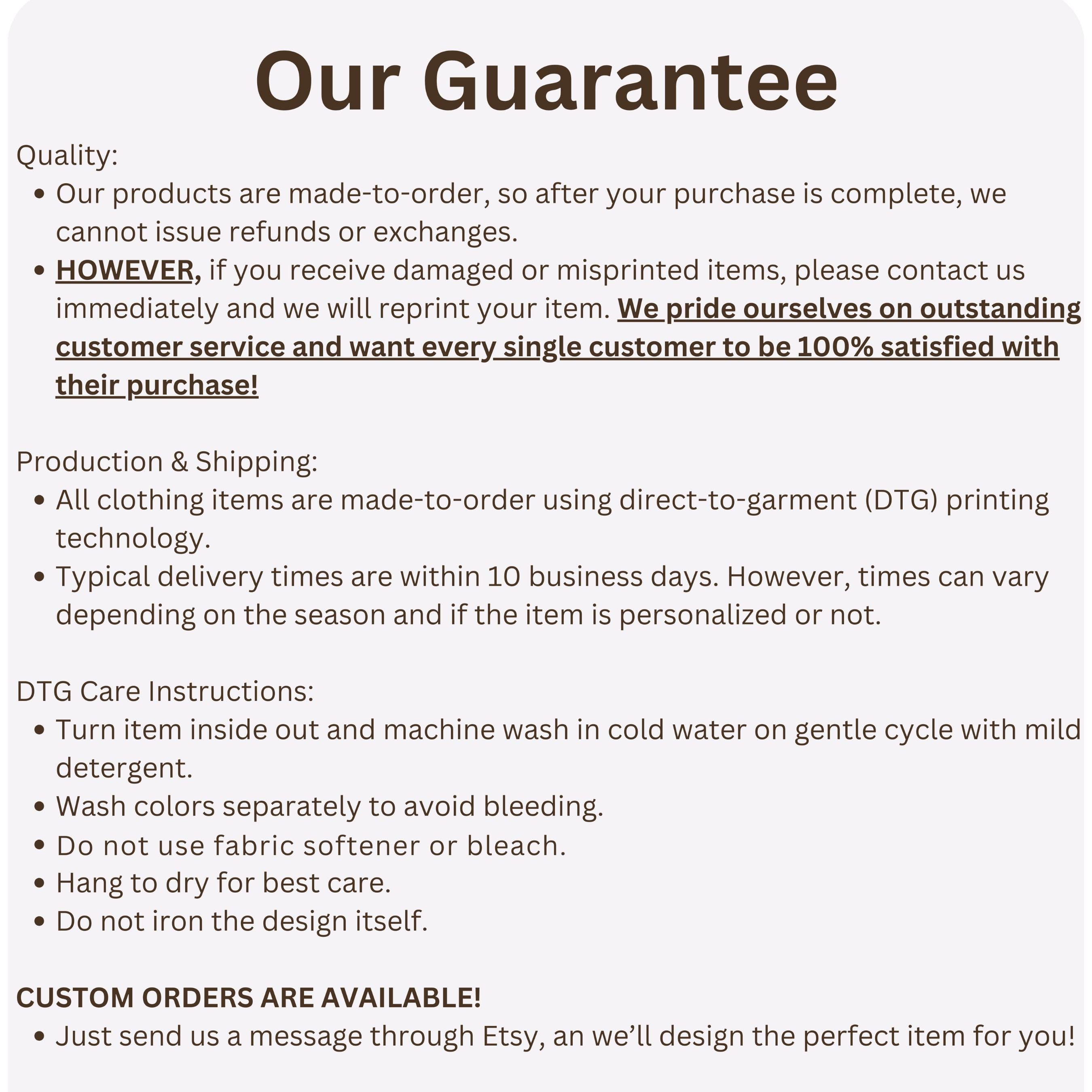- Although we cannot accept returns or exchanges because our items are made-to-order, if you receive the wrong item, or your item is damaged, please reach out and we will either ship you a new item at no charge, or offer a refund depending on the situation. Thank you so much! We want all of our customers to be happy with their new product!