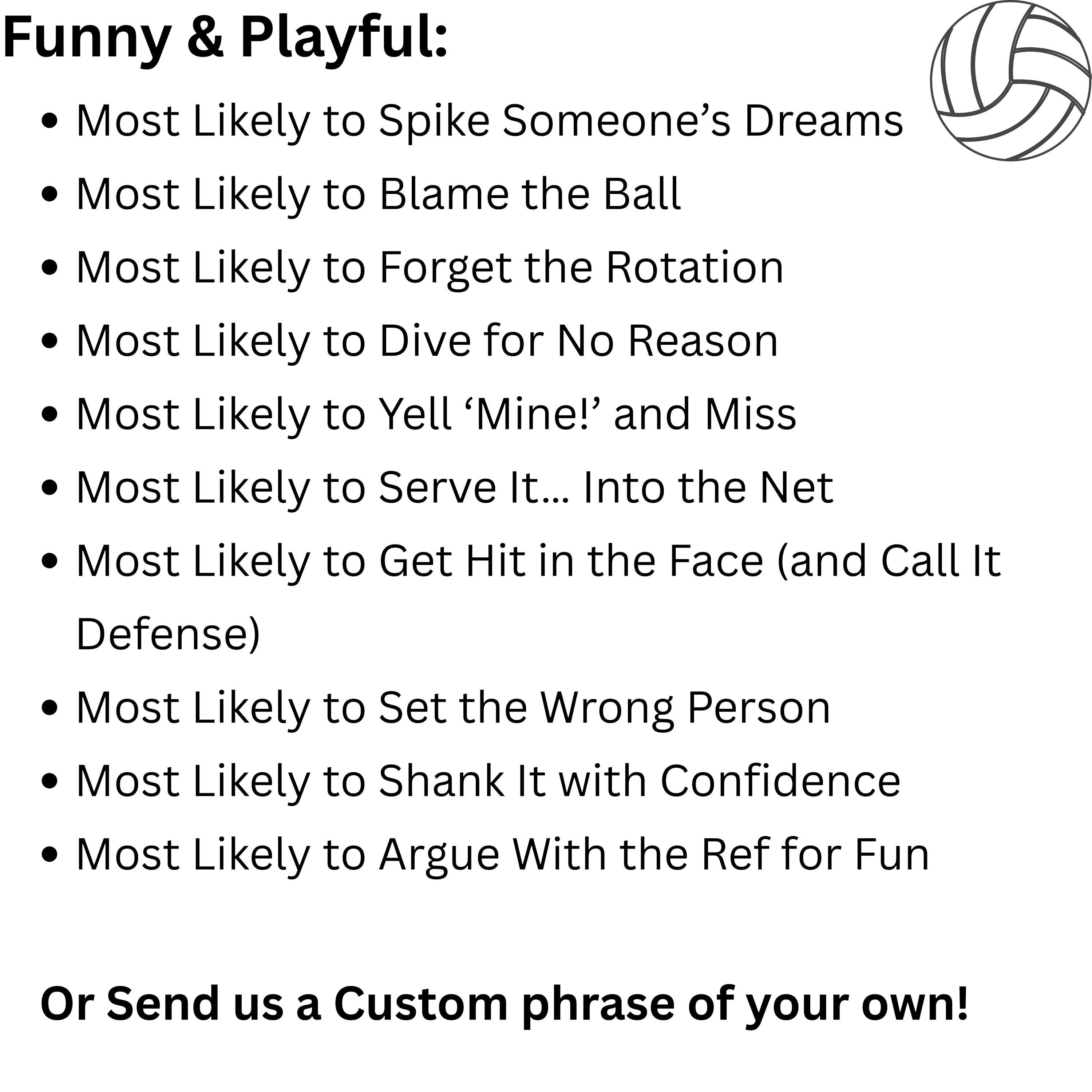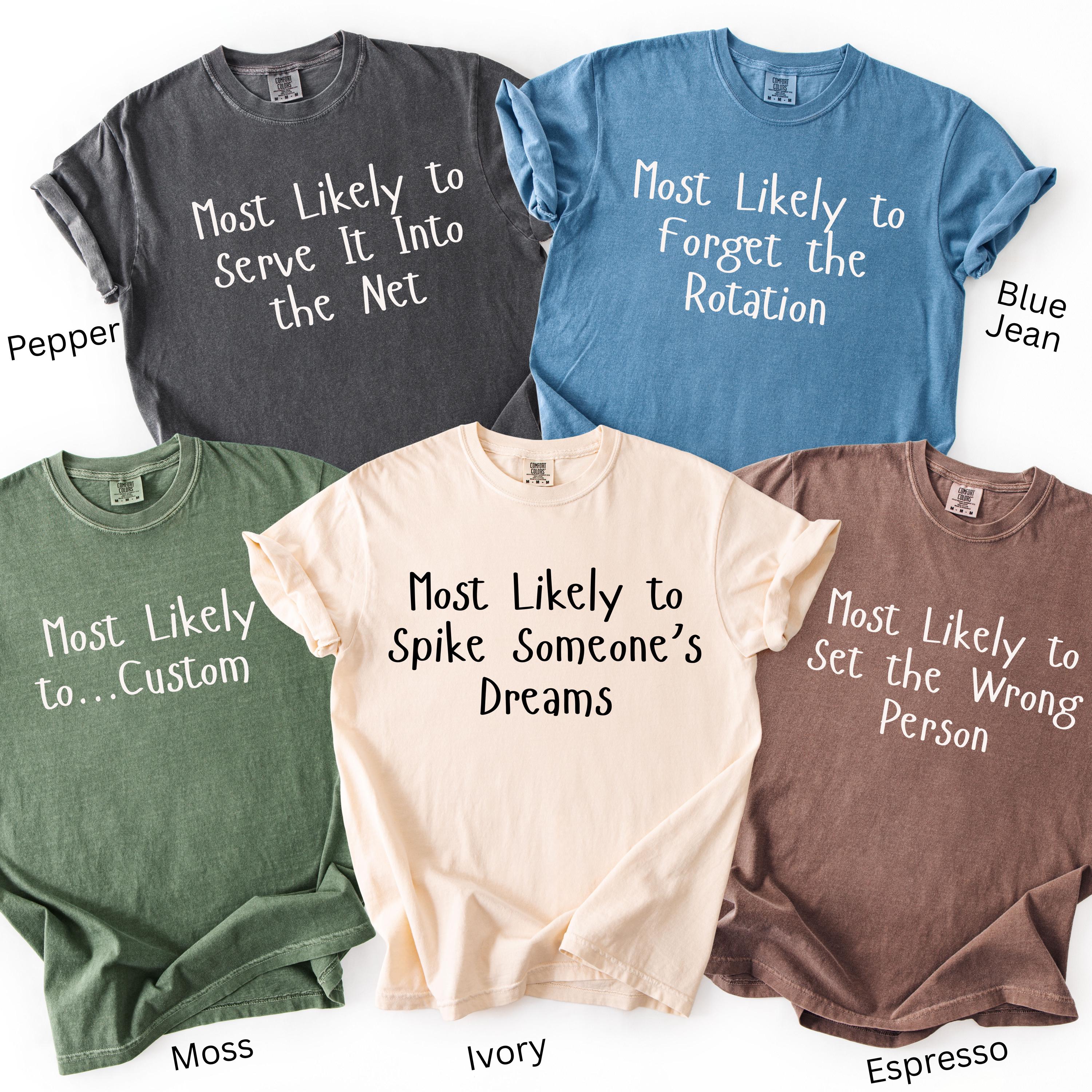 Make your volleyball team stand out with this custom volleyball team tee and game day giftshirt design, perfect for team spirit shirt wear and practice uniform style. This comfort color cotton tee features a playful "Most Likely to Spike Someone's Dreams" design, ideal for game day or daily wear, creating a personalizedtee that celebrates your passion.
