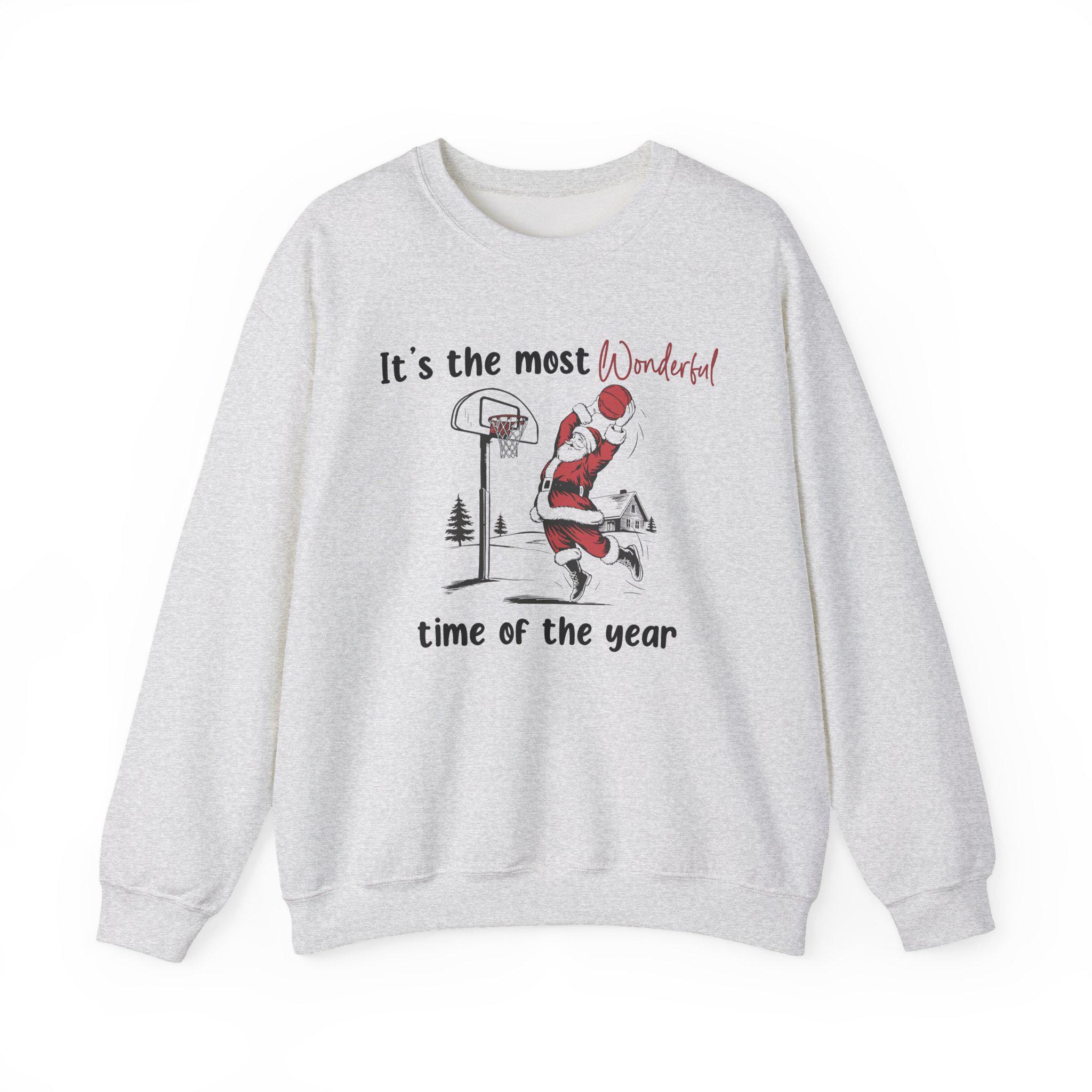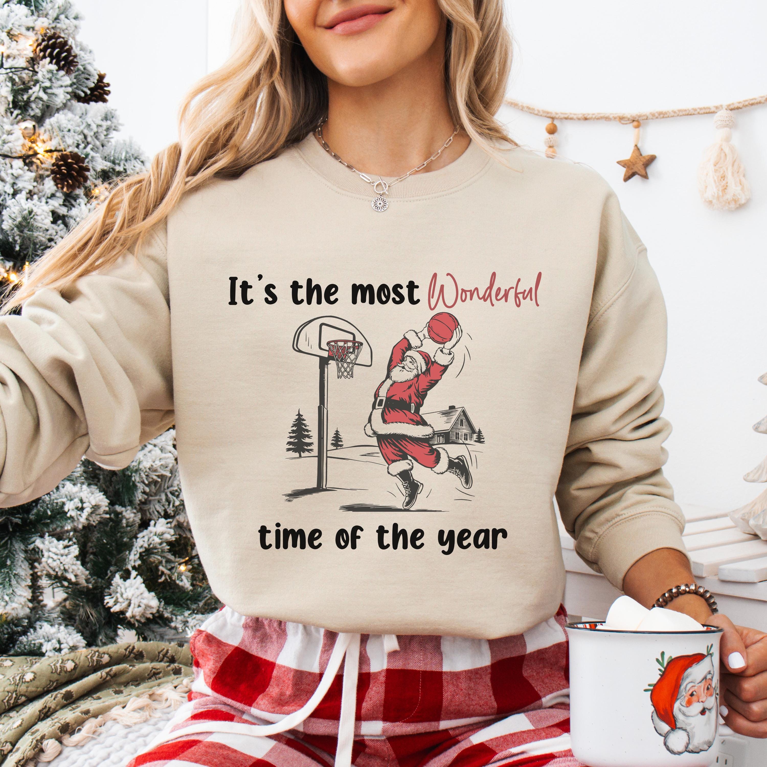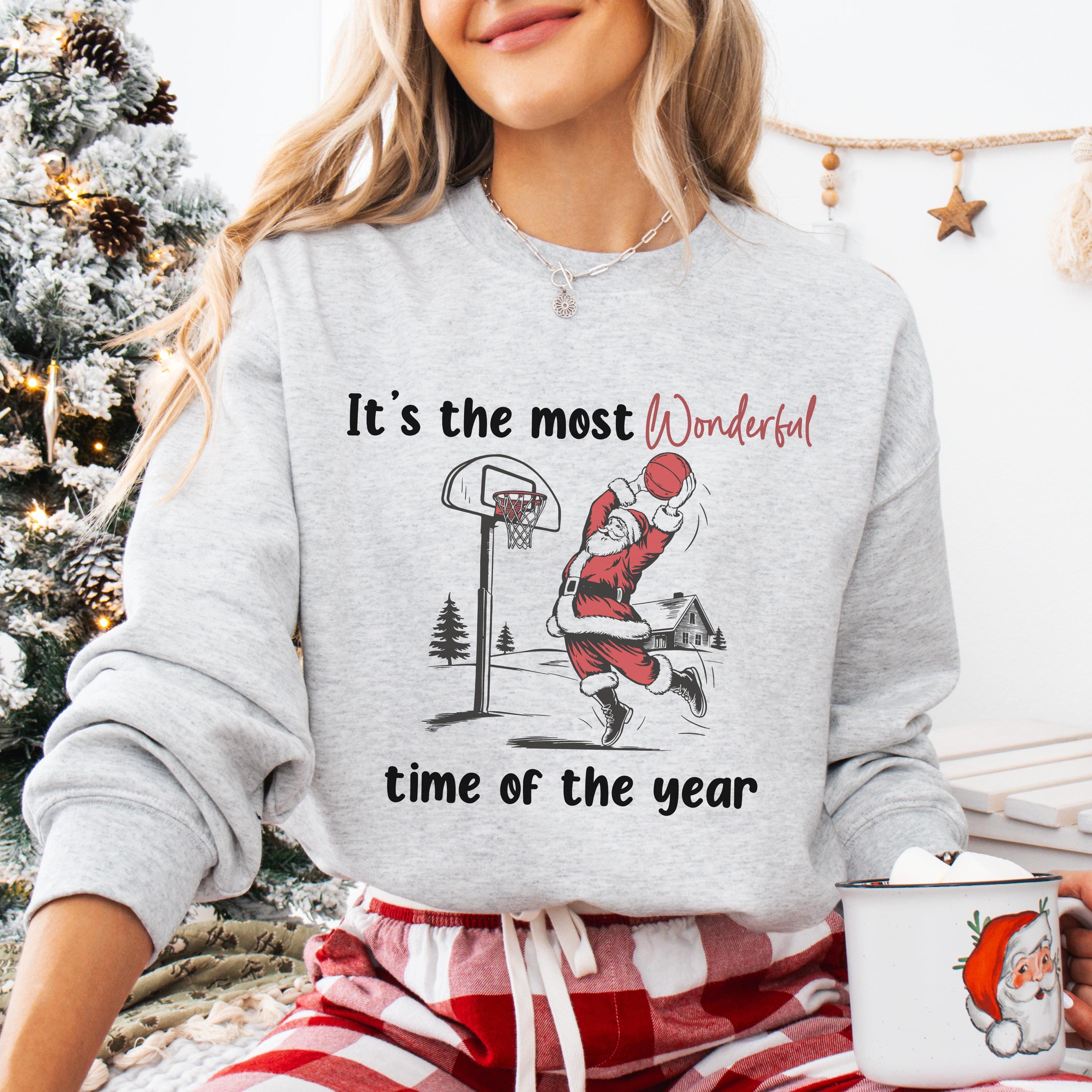 * Premium white cotton crewneck featuring Santa Claus dunking a basketball with "It's the most Wonderful time of the year" text (with "Wonderful" in eye-catching red script)