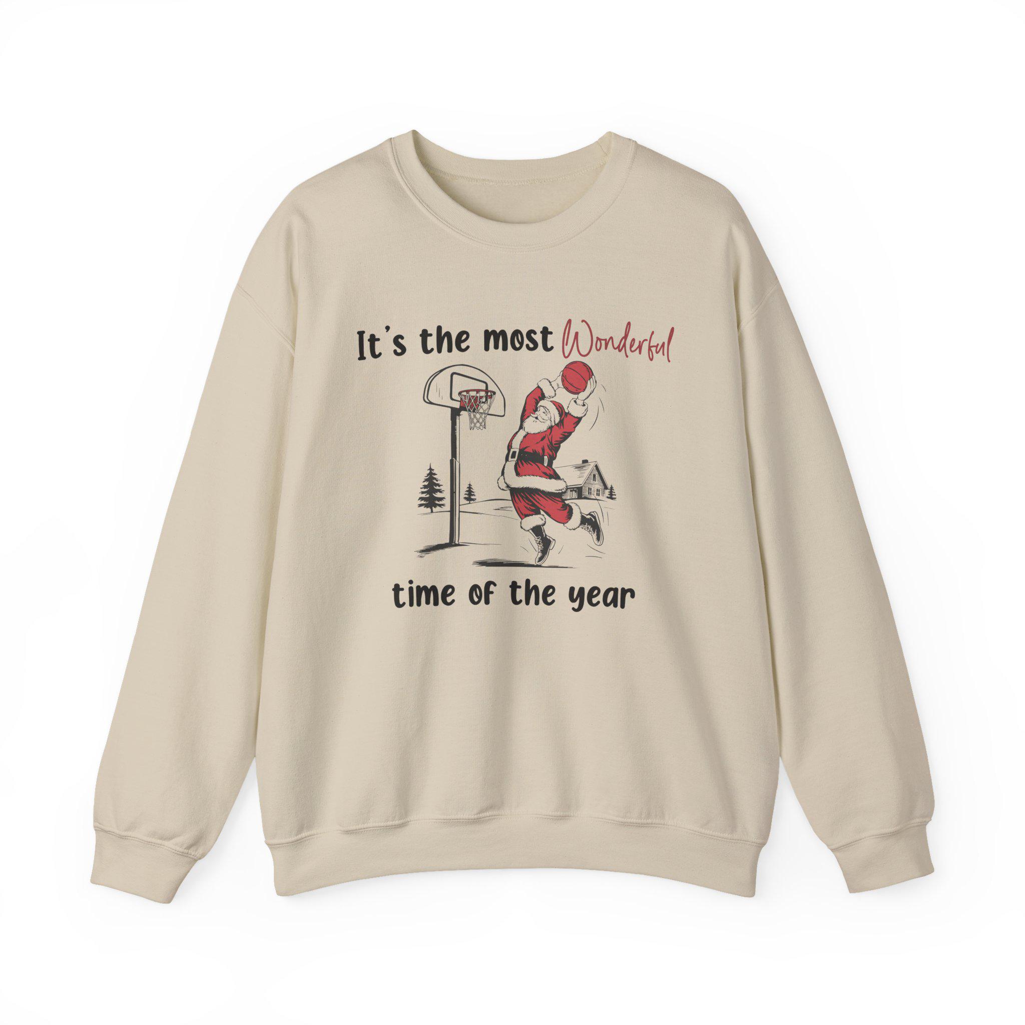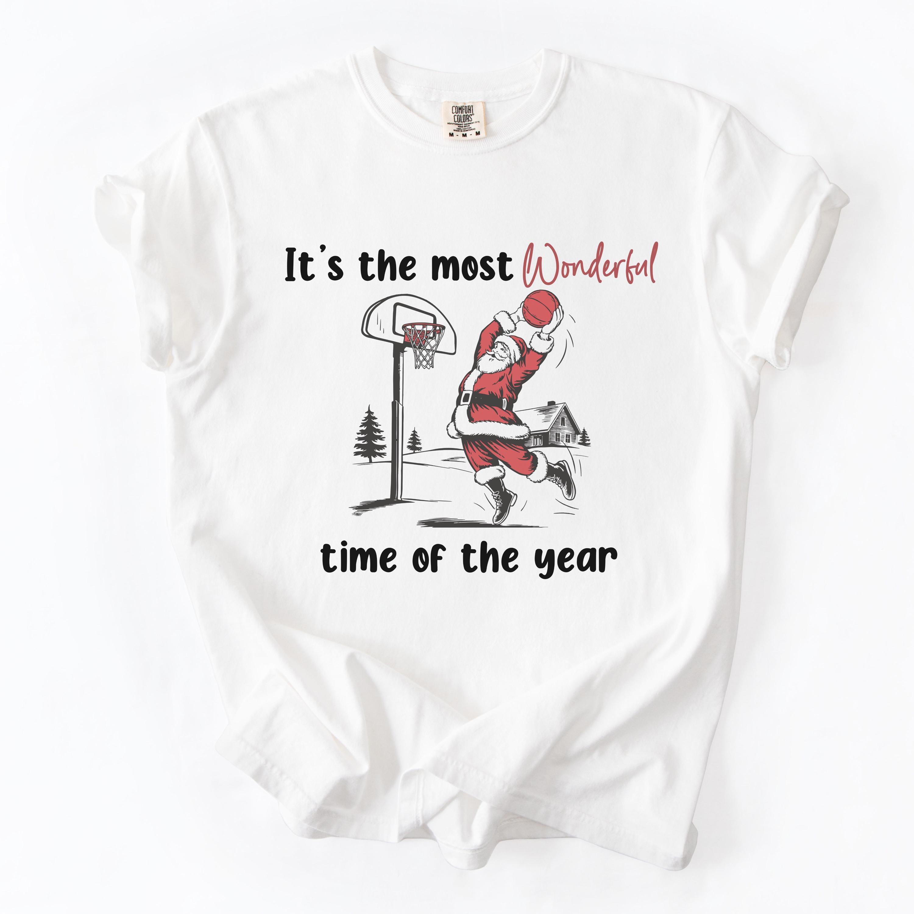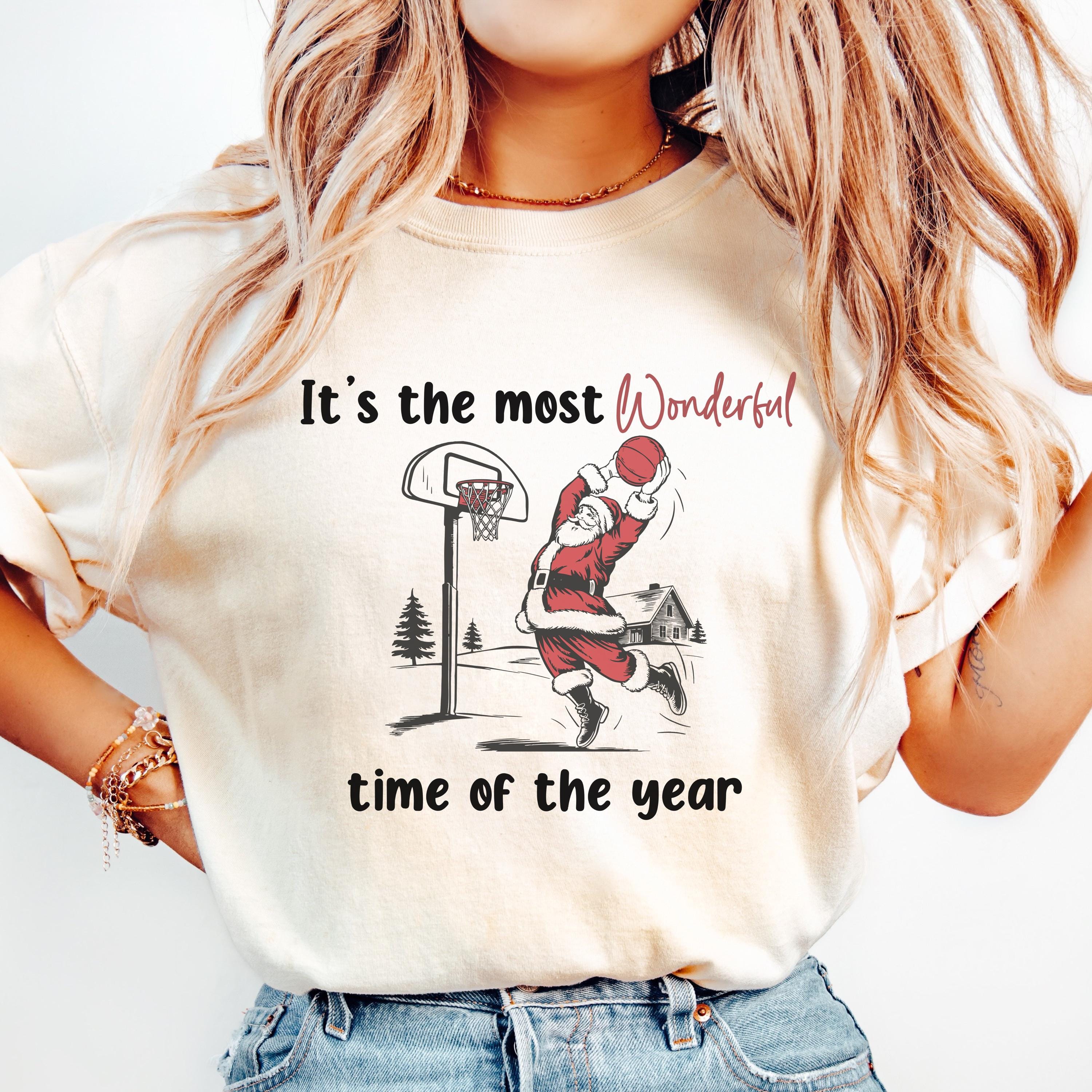 * Premium white cotton crewneck featuring Santa Claus dunking a basketball with "It's the most Wonderful time of the year" text (with "Wonderful" in eye-catching red script)