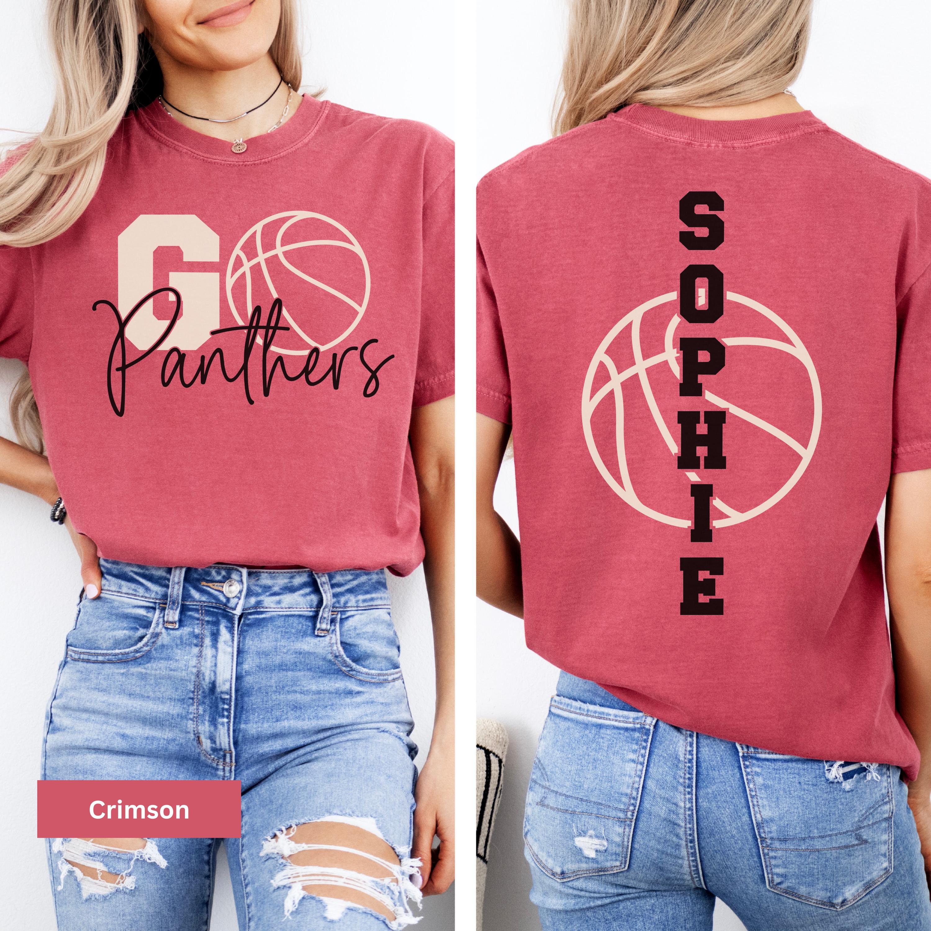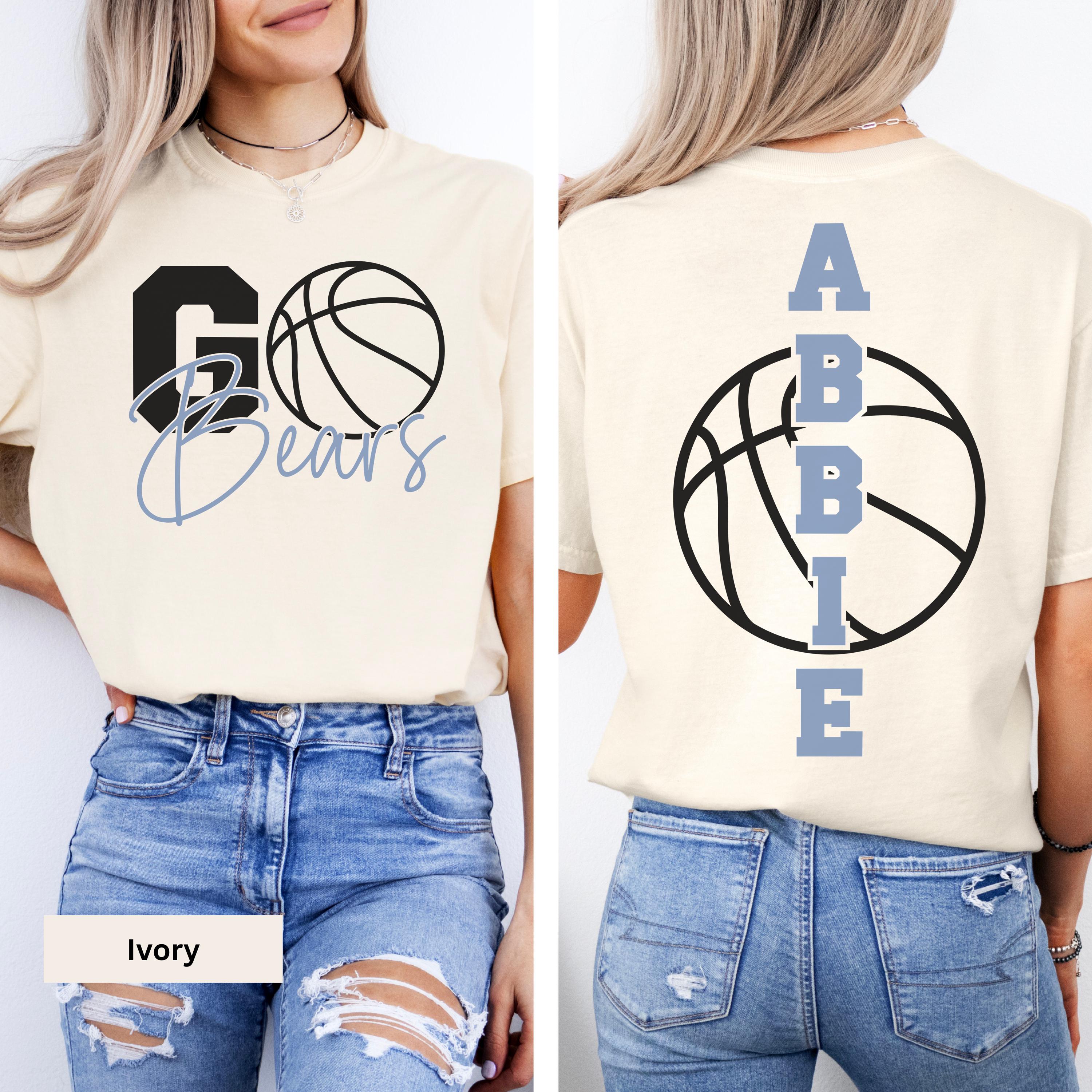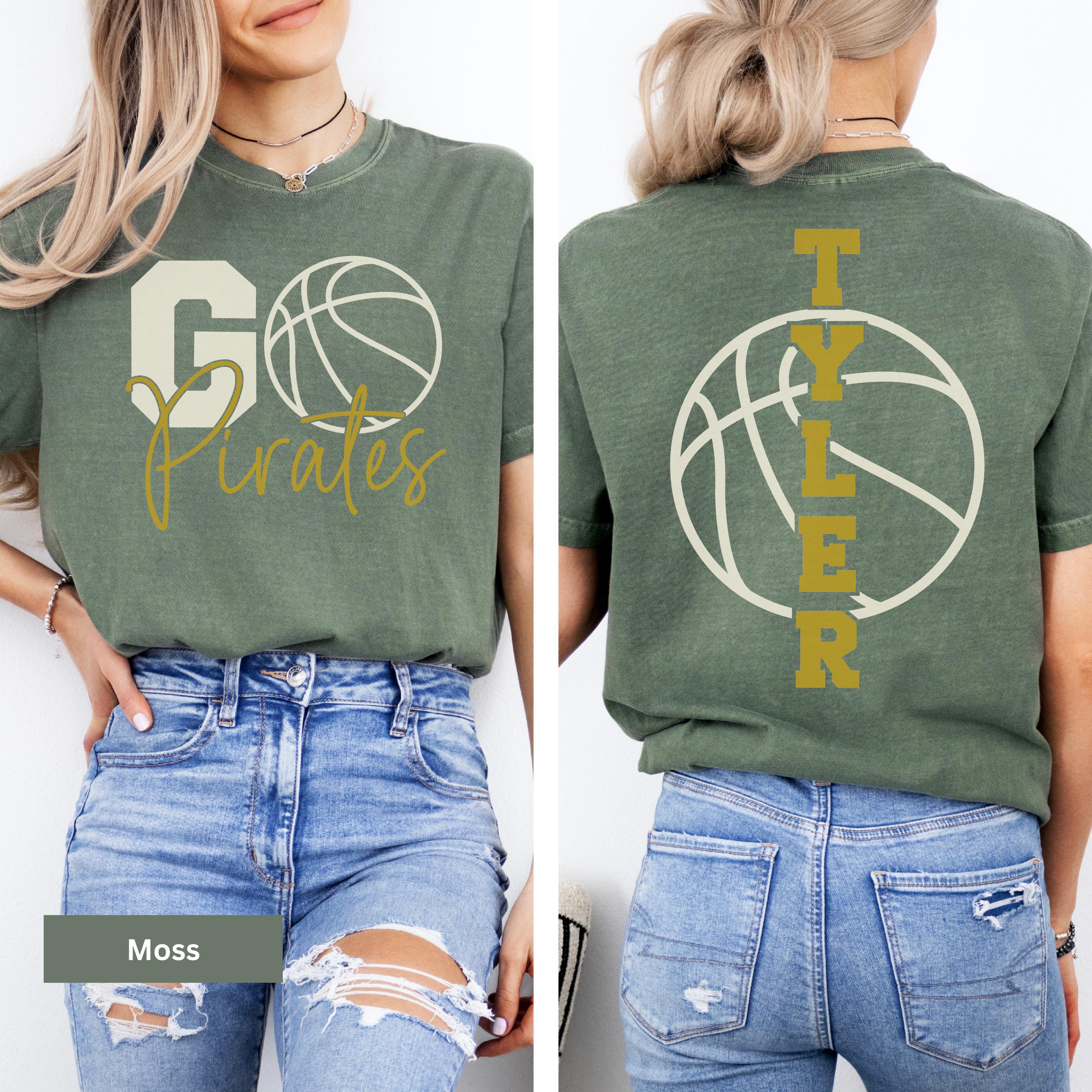 • Custom player tee featuring team name and basketball graphic on front, with player name vertically printed on back