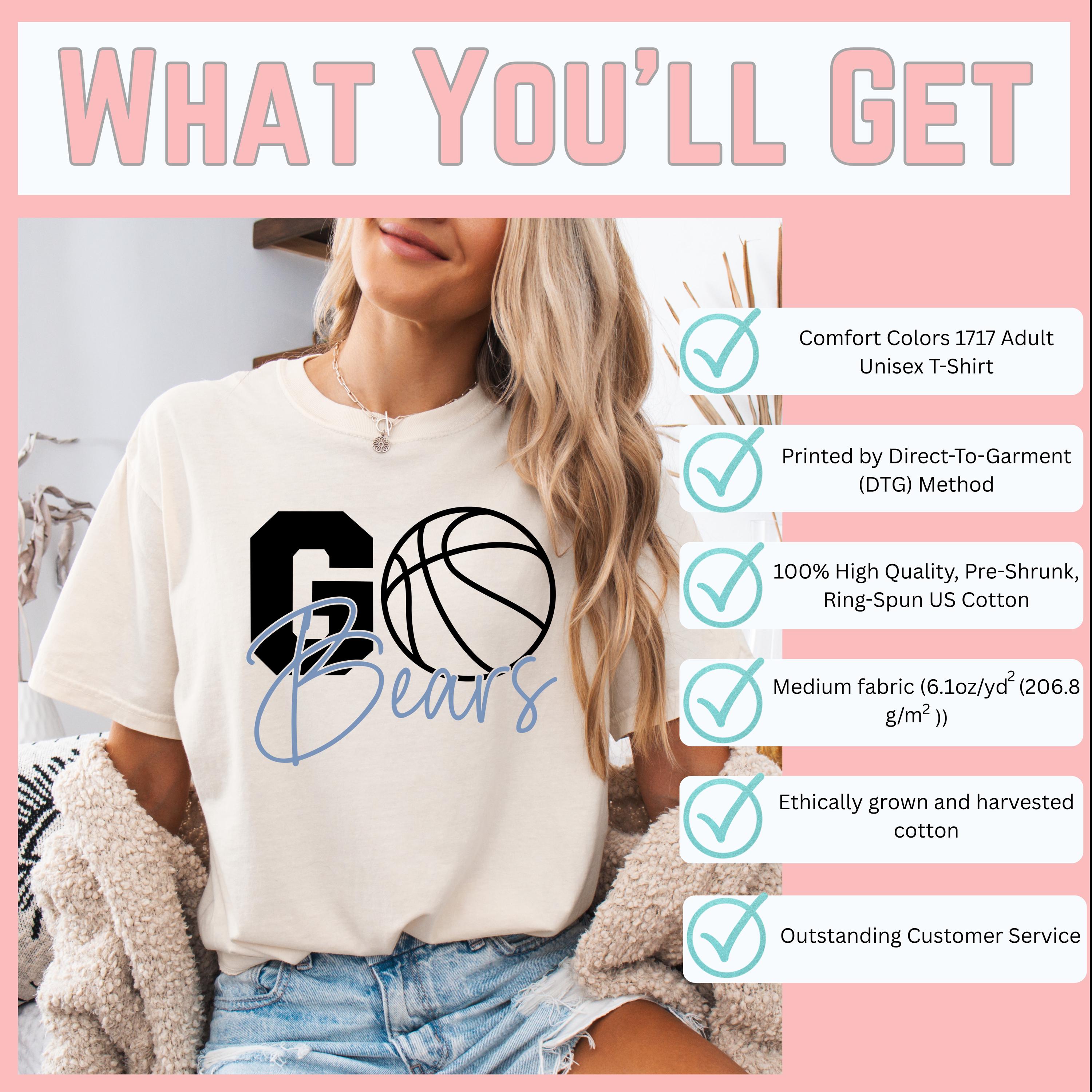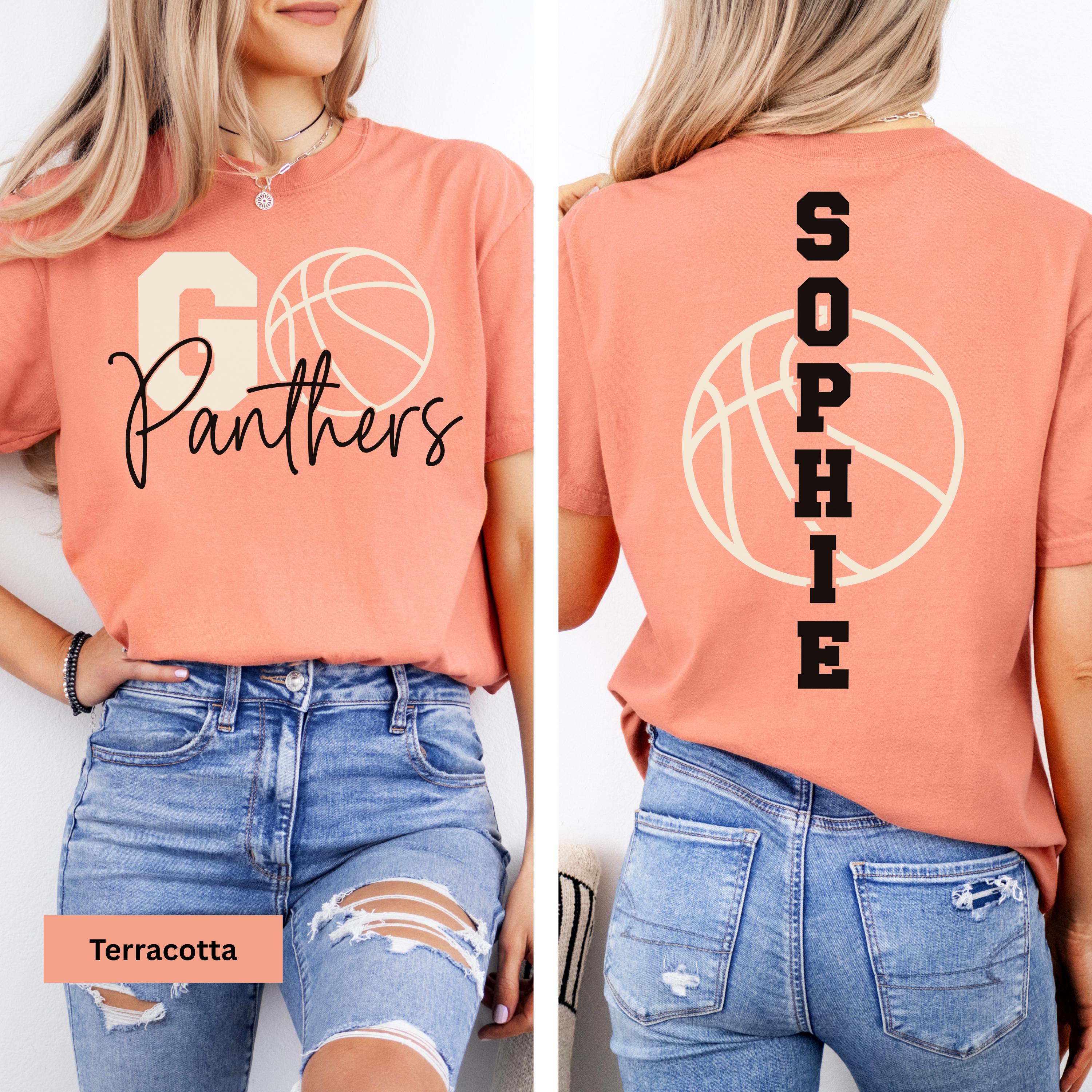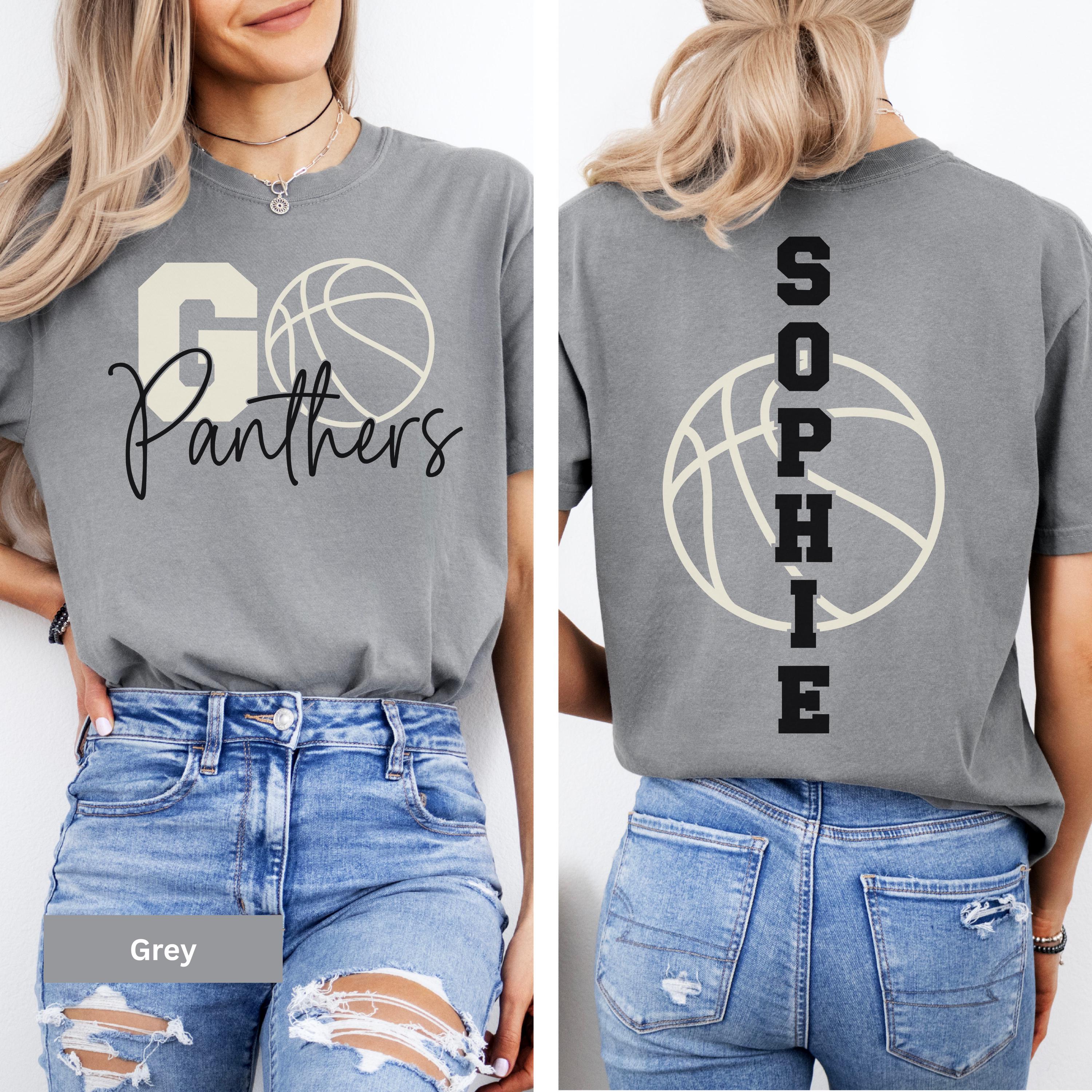 • Custom player tee featuring team name and basketball graphic on front, with player name vertically printed on back