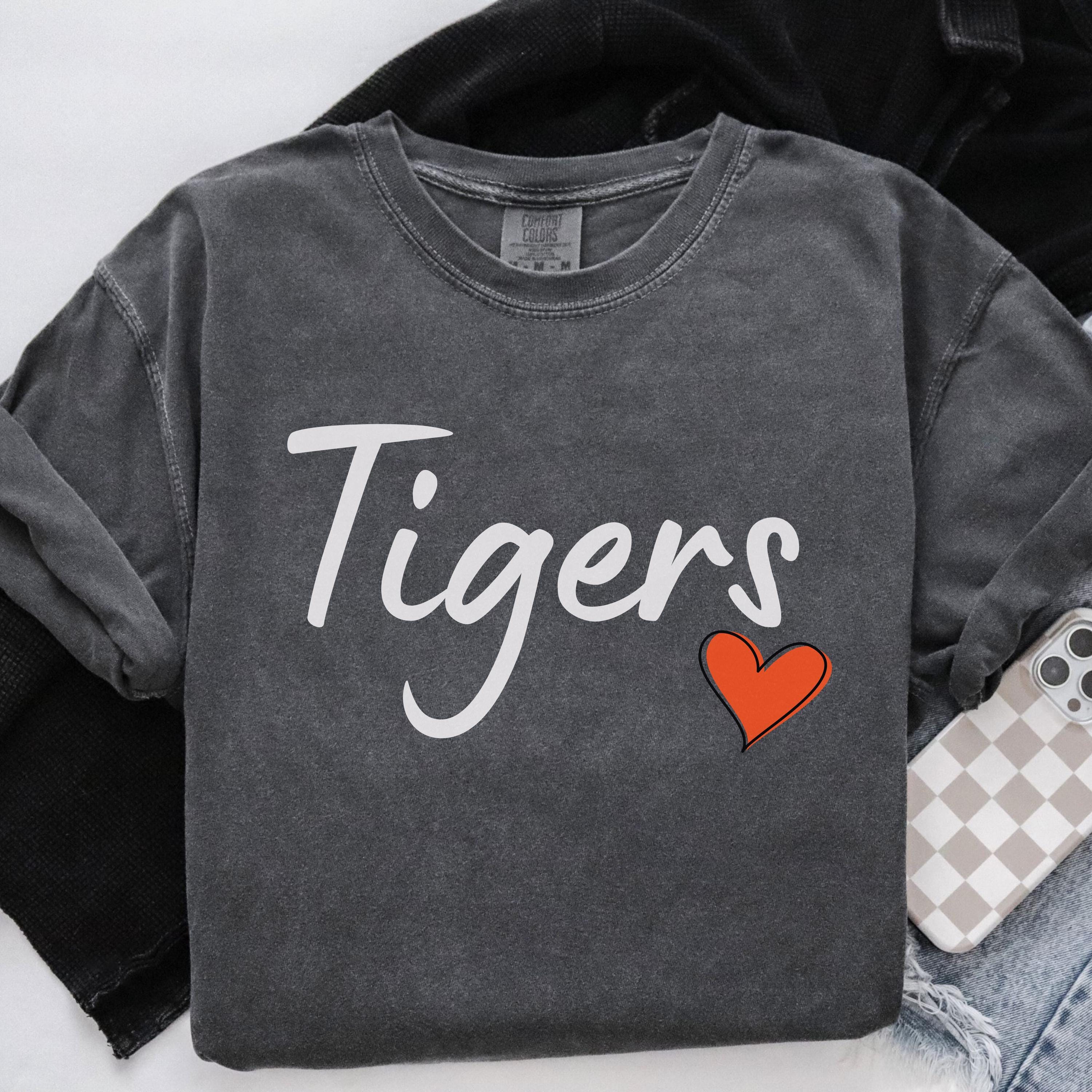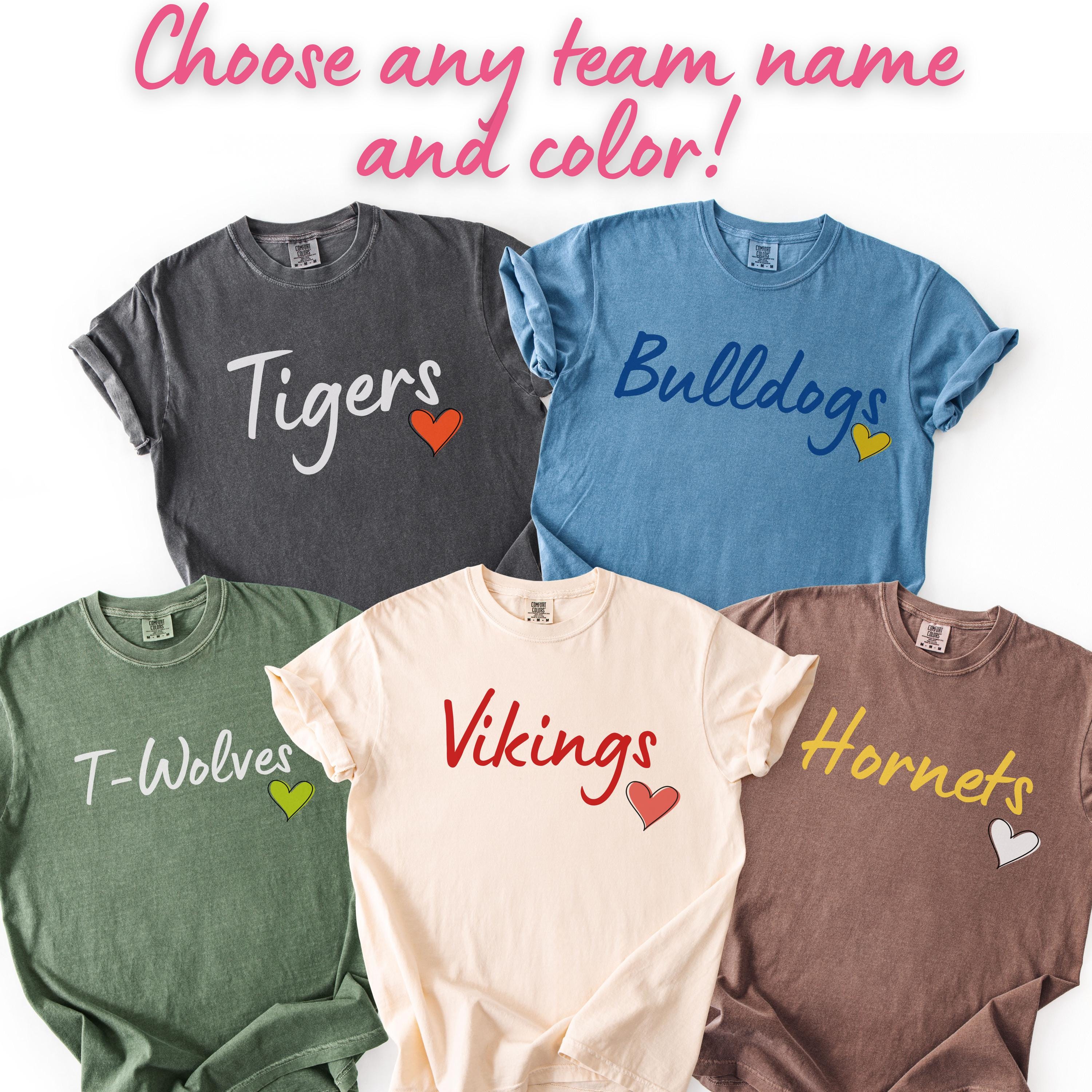 Show your team pride with this custom team shirt featuring a charming heart design on a soft cotton tee, perfect for sport lovers and team mascot supporters alike. This versatile cheers shirt is the ultimate school spirit wear apparel for game day, providing athletic supporter groups with the perfect fan clothing for showing team solidarity.