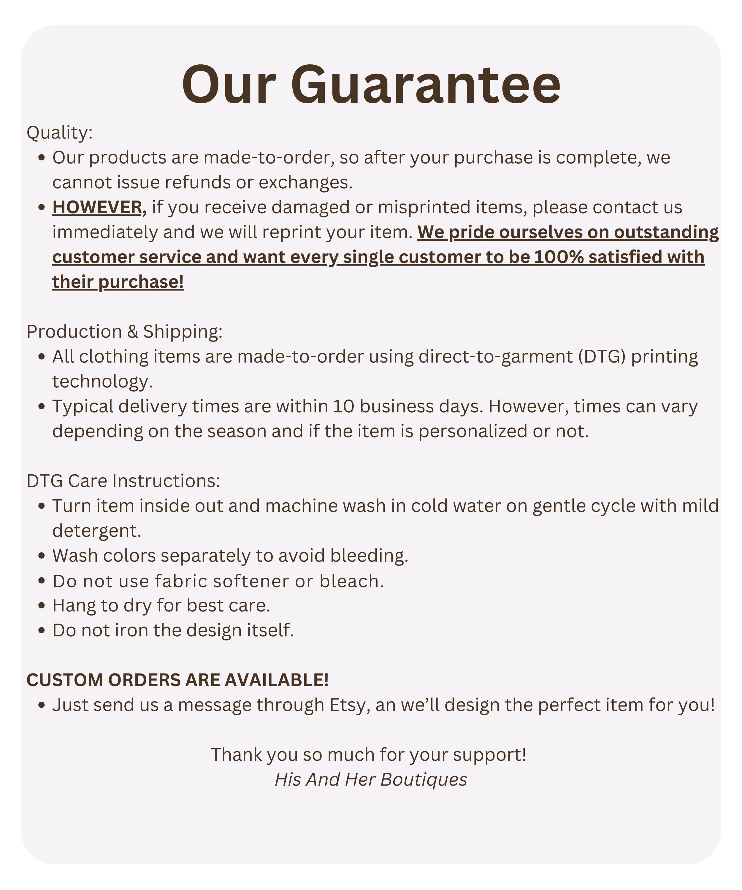 - Although we cannot accept returns or exchanges because our items are made-to-order, if you receive the wrong item, or your item is damaged, please reach out and we will either ship you a new item at no charge, or offer a refund depending on the situation. Thank you so much! We want all of our customers to be happy with their new product!