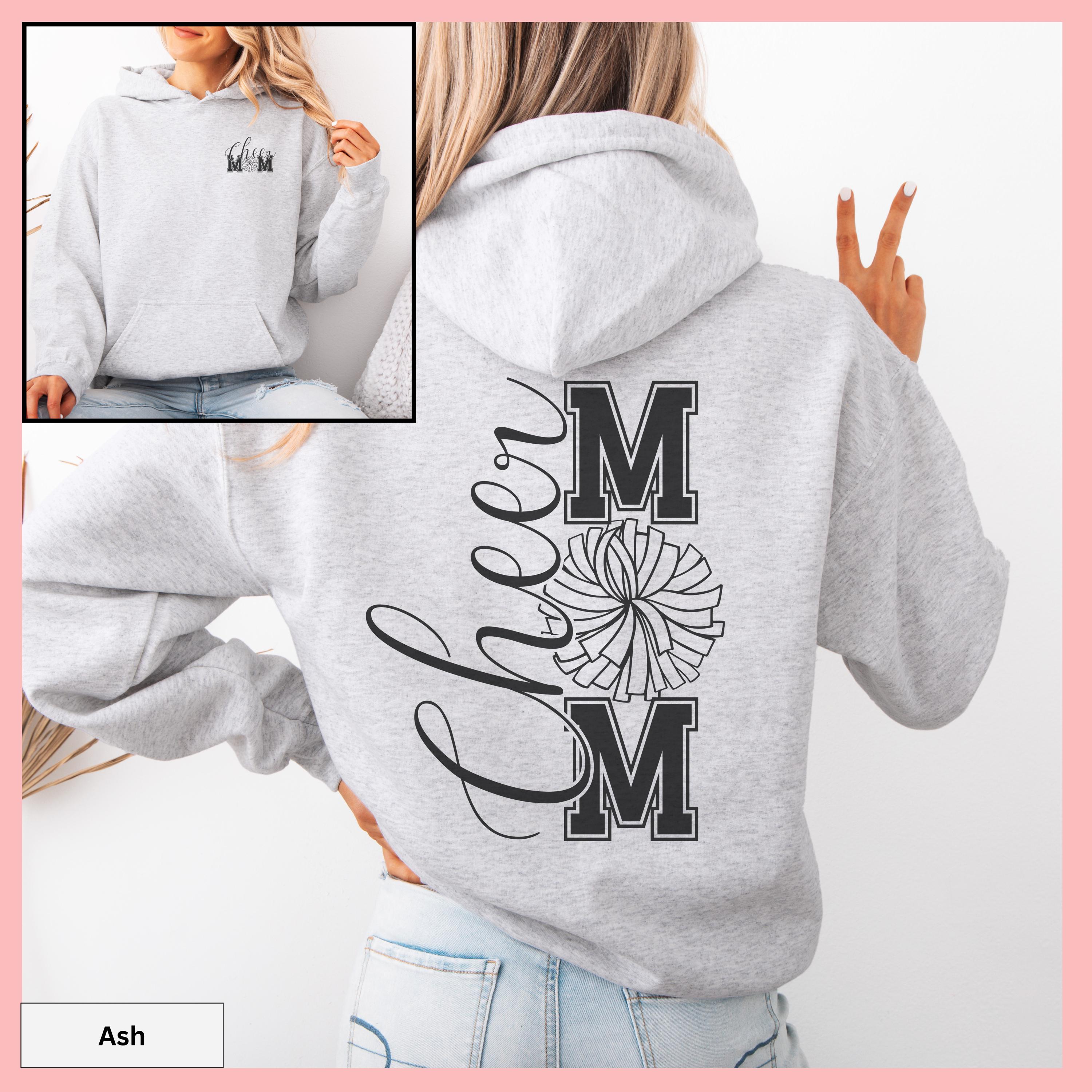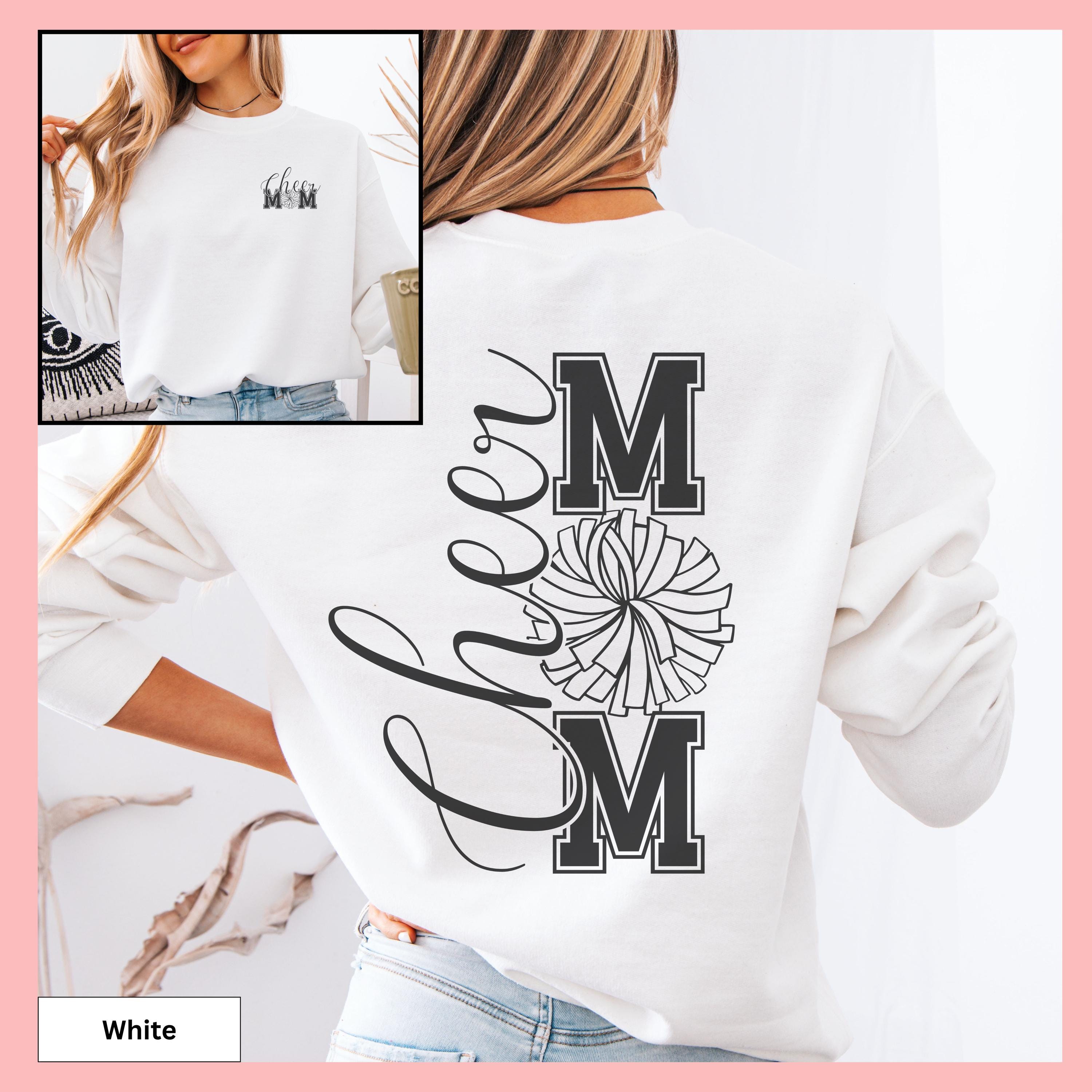 • Features a small cheer mom design on the front chest and larger "Cheer Mom" text with pompom illustration on the back