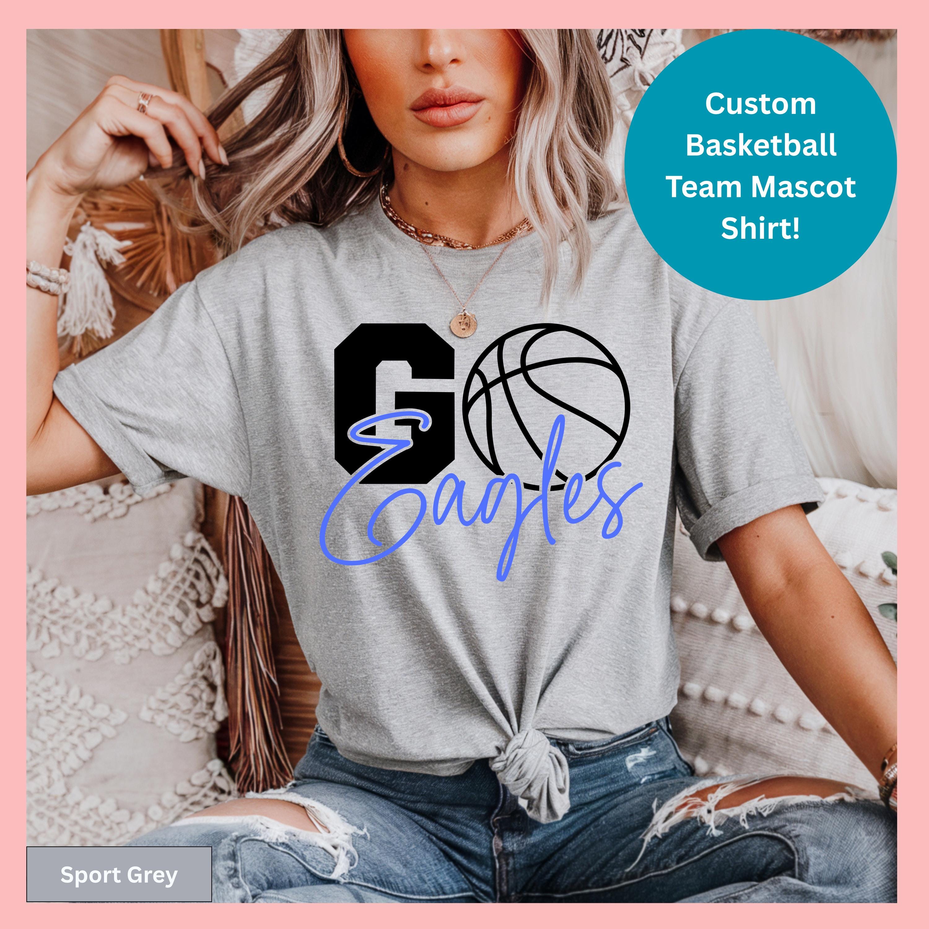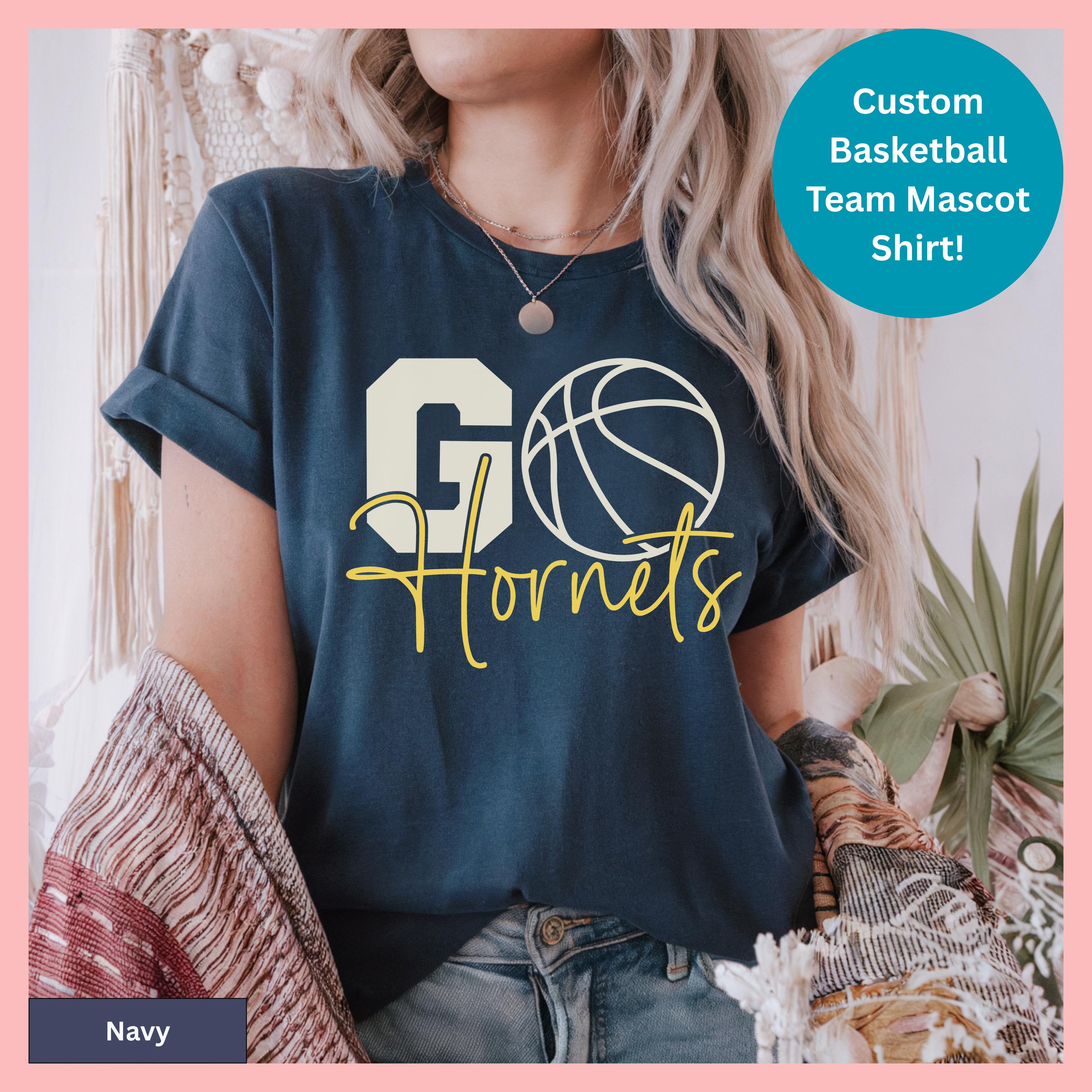 Show your team pride with this basketball team shirt featuring custom design elements perfect for school apparel and athletic events. This cotton athletic tshirt can be personalized as a sports jersey with a basketball graphic tee design that showcases your team mascot in style.
