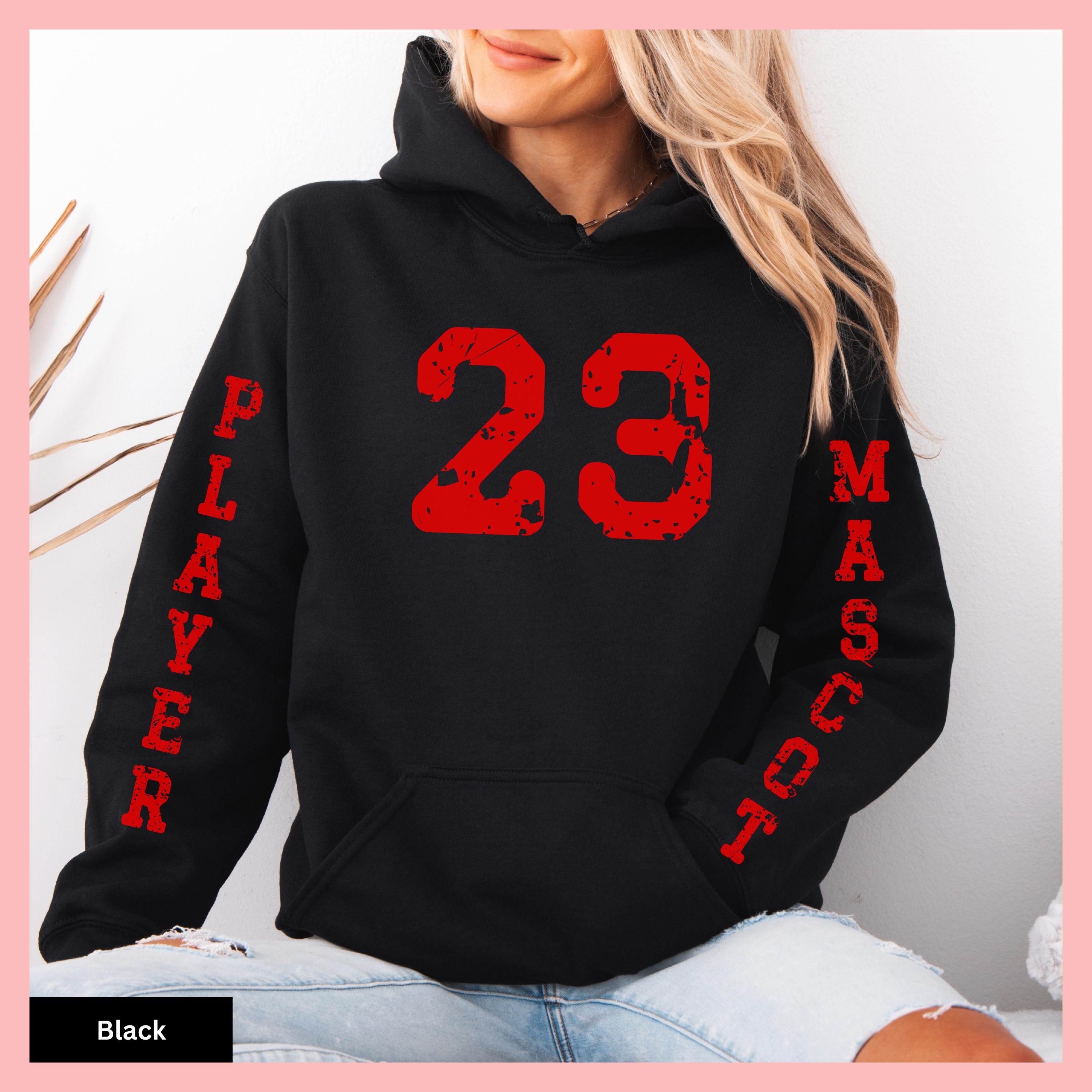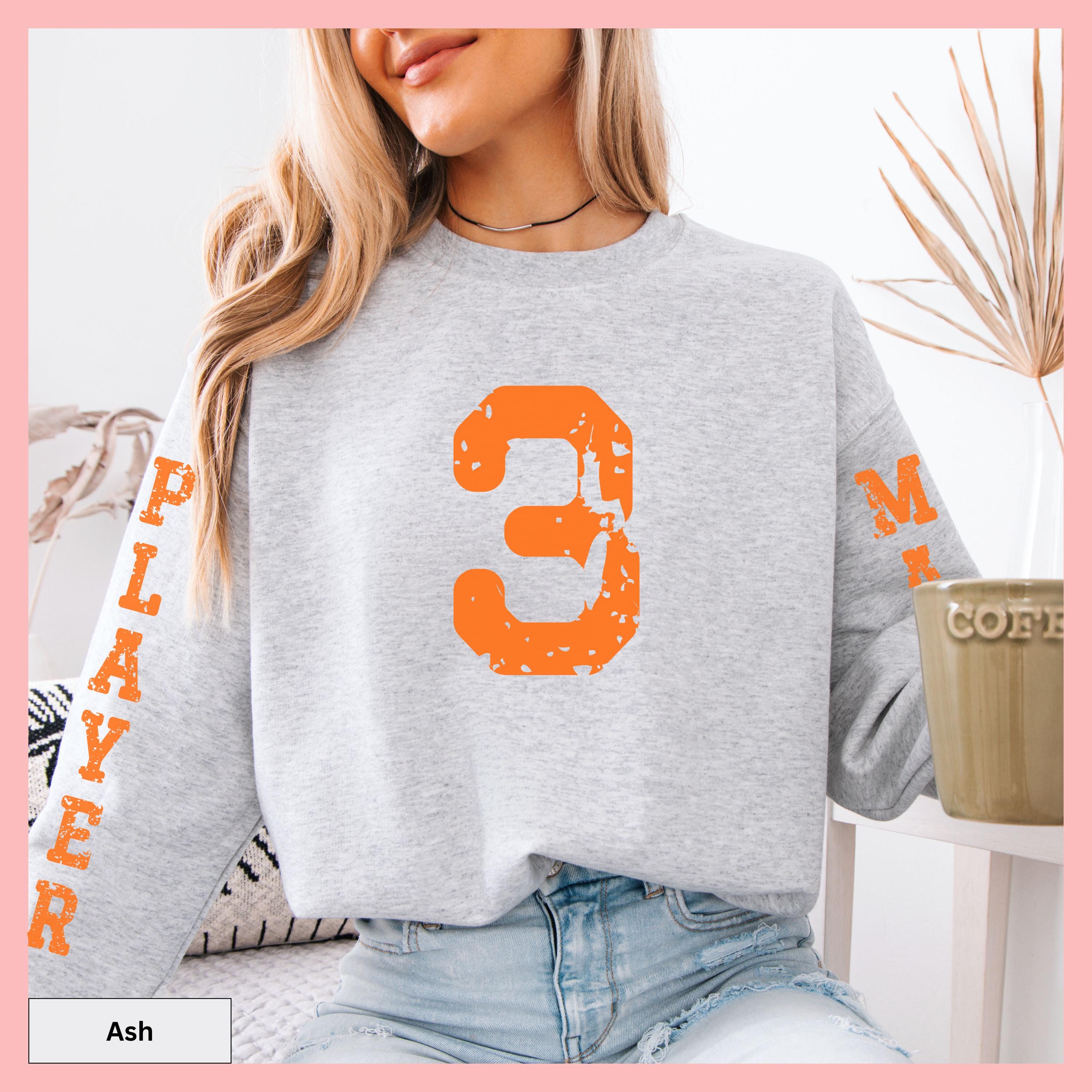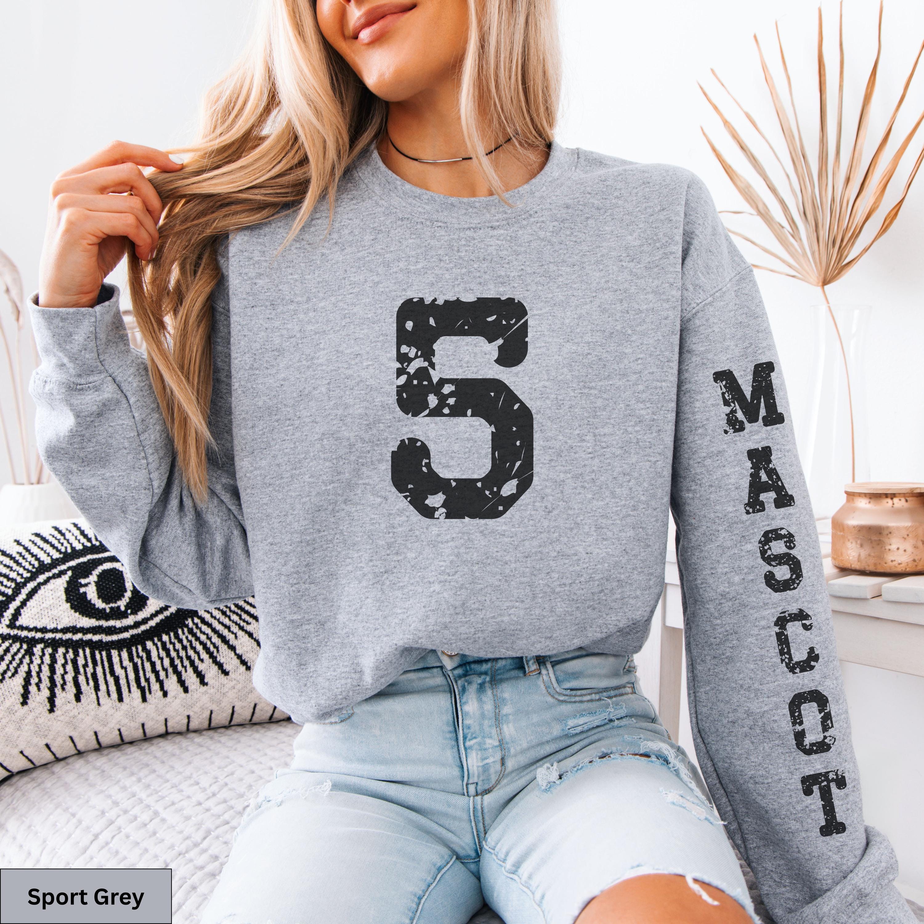 Show your team spirit with this custom team sweatshirt featuring a personalized jersey number and player's name, perfect for creating the ultimate gameday outfit for basketball fans. This sports apparel crewneck combines comfort with personalization, showcasing your team mascot graphic on one sleeve and your player's name on the other, making it an ideal shirt for proud sports moms and fans alike.