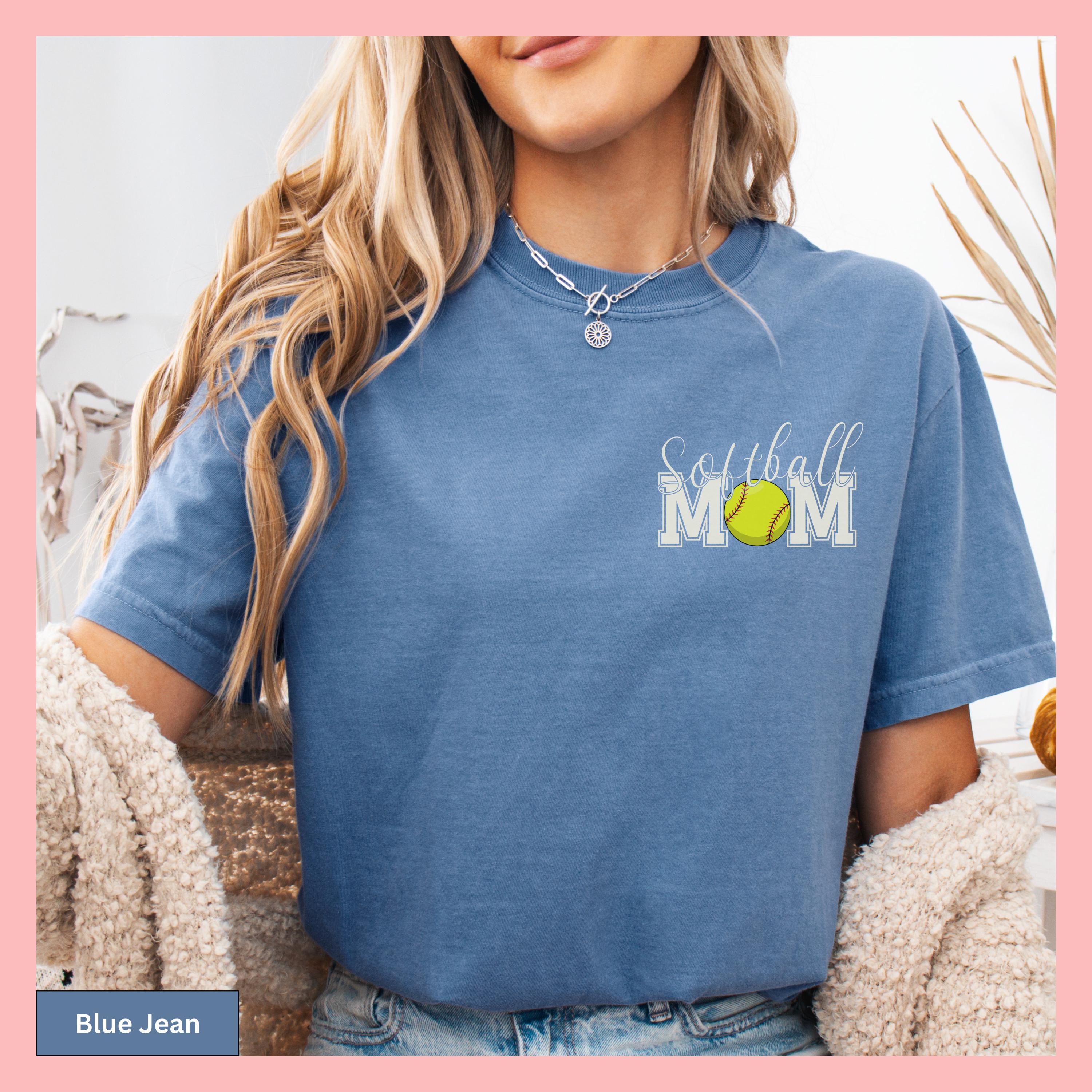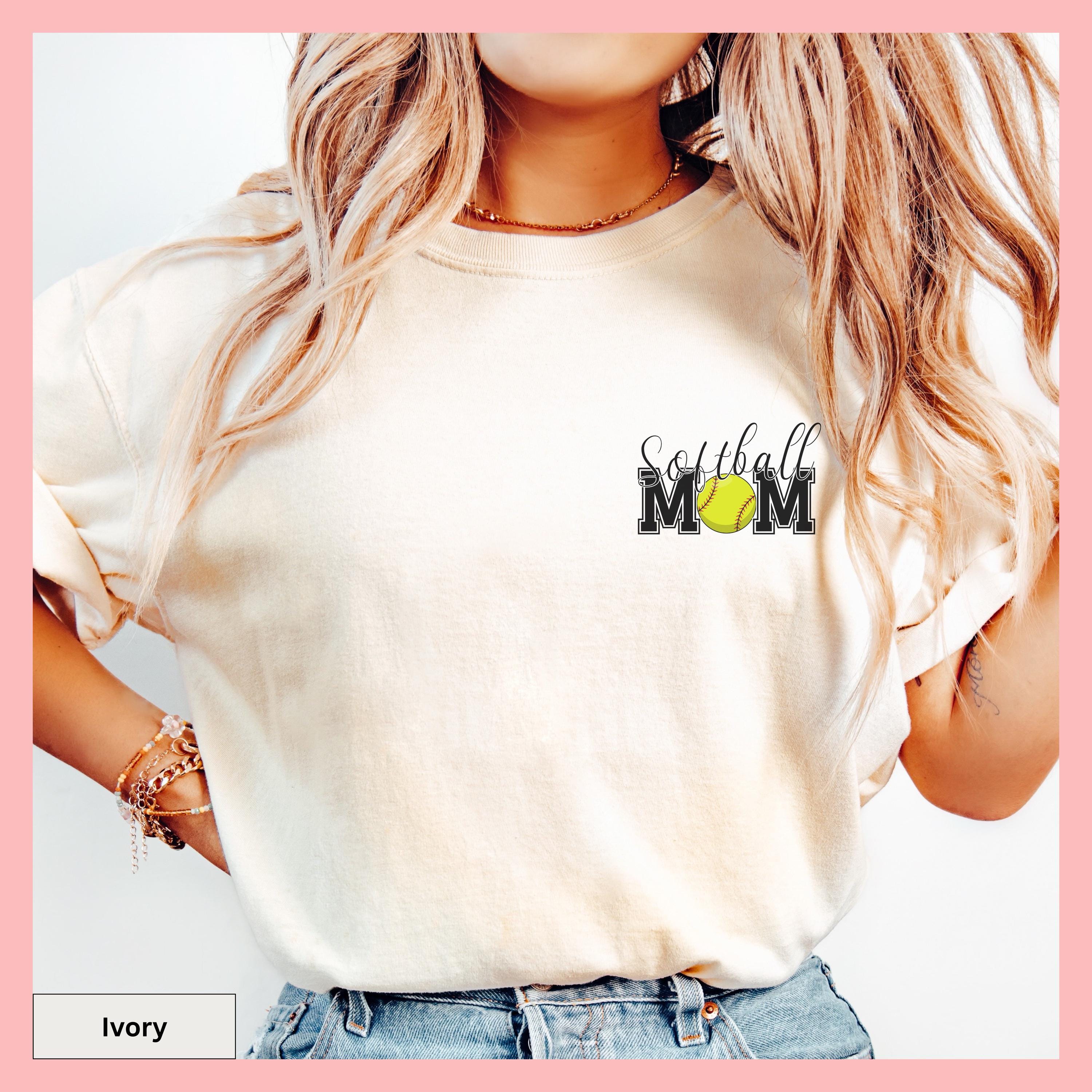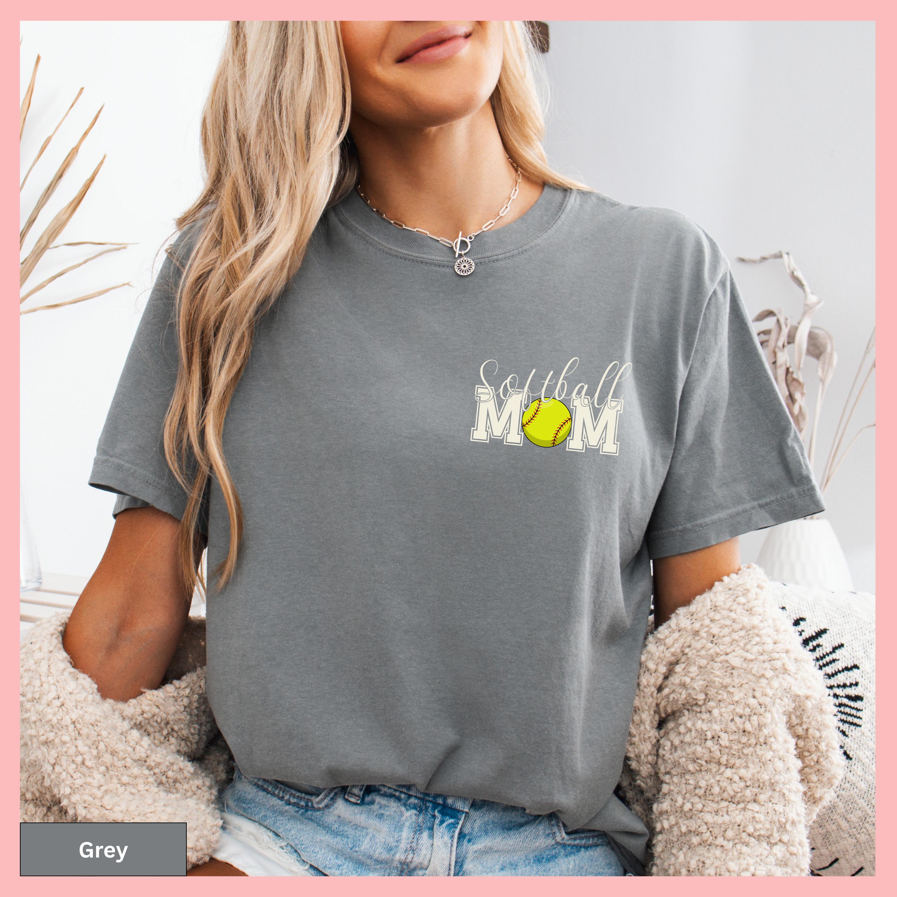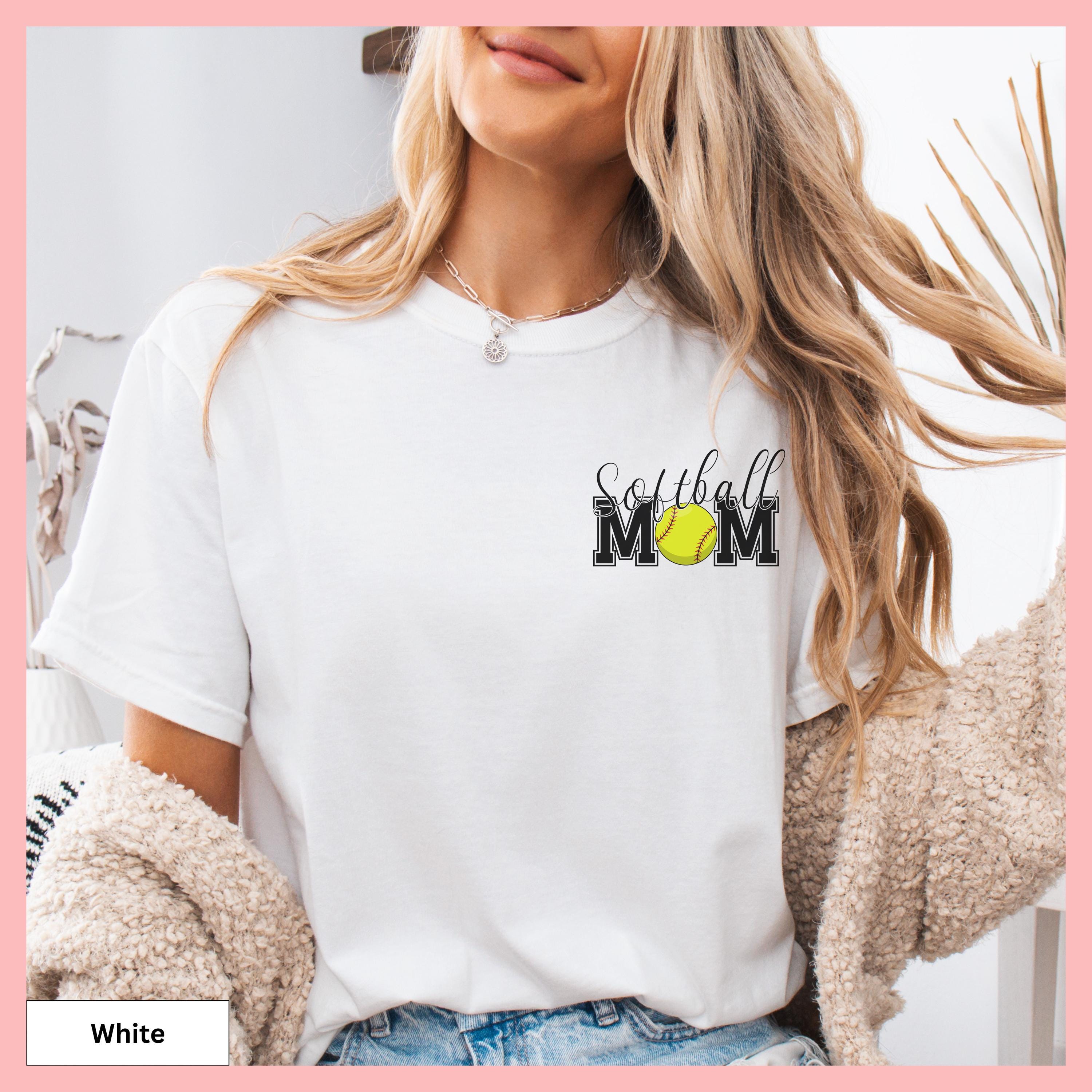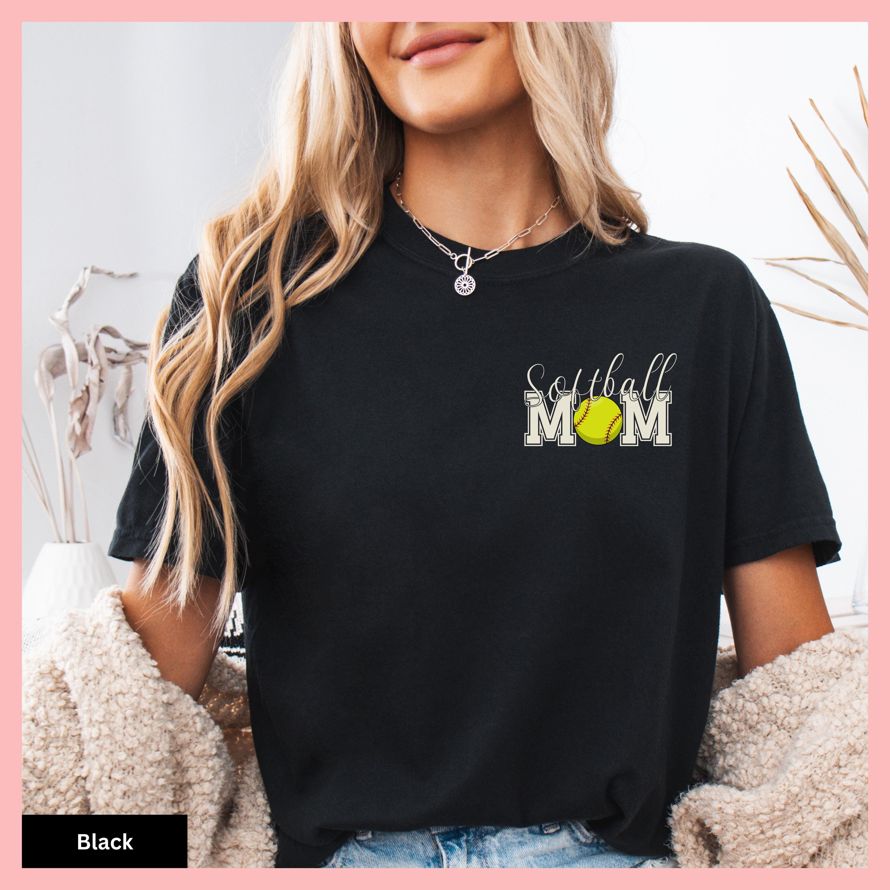 • Cotton t-shirt featuring "Softball MOM" text and yellow softball graphic prominently displayed on the front