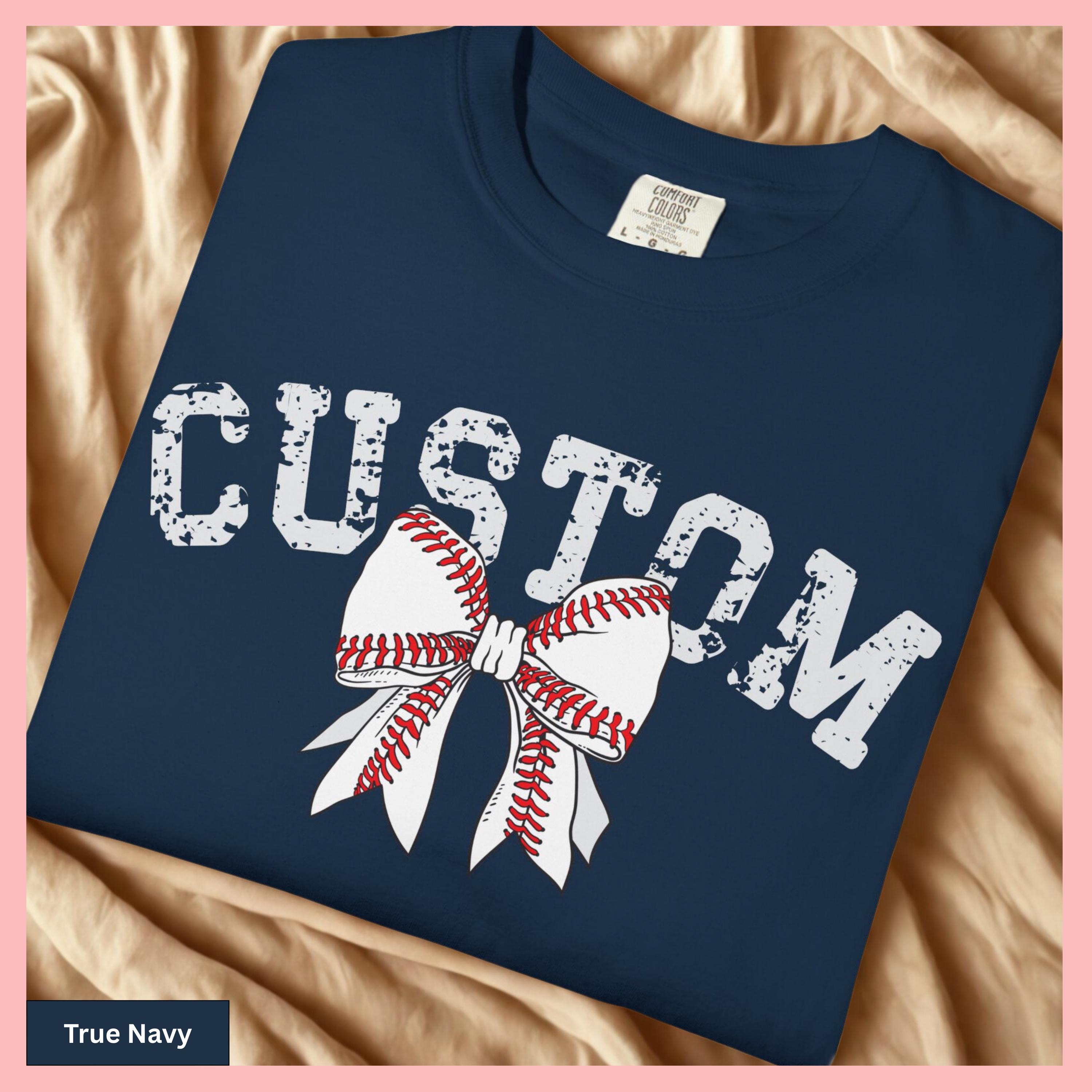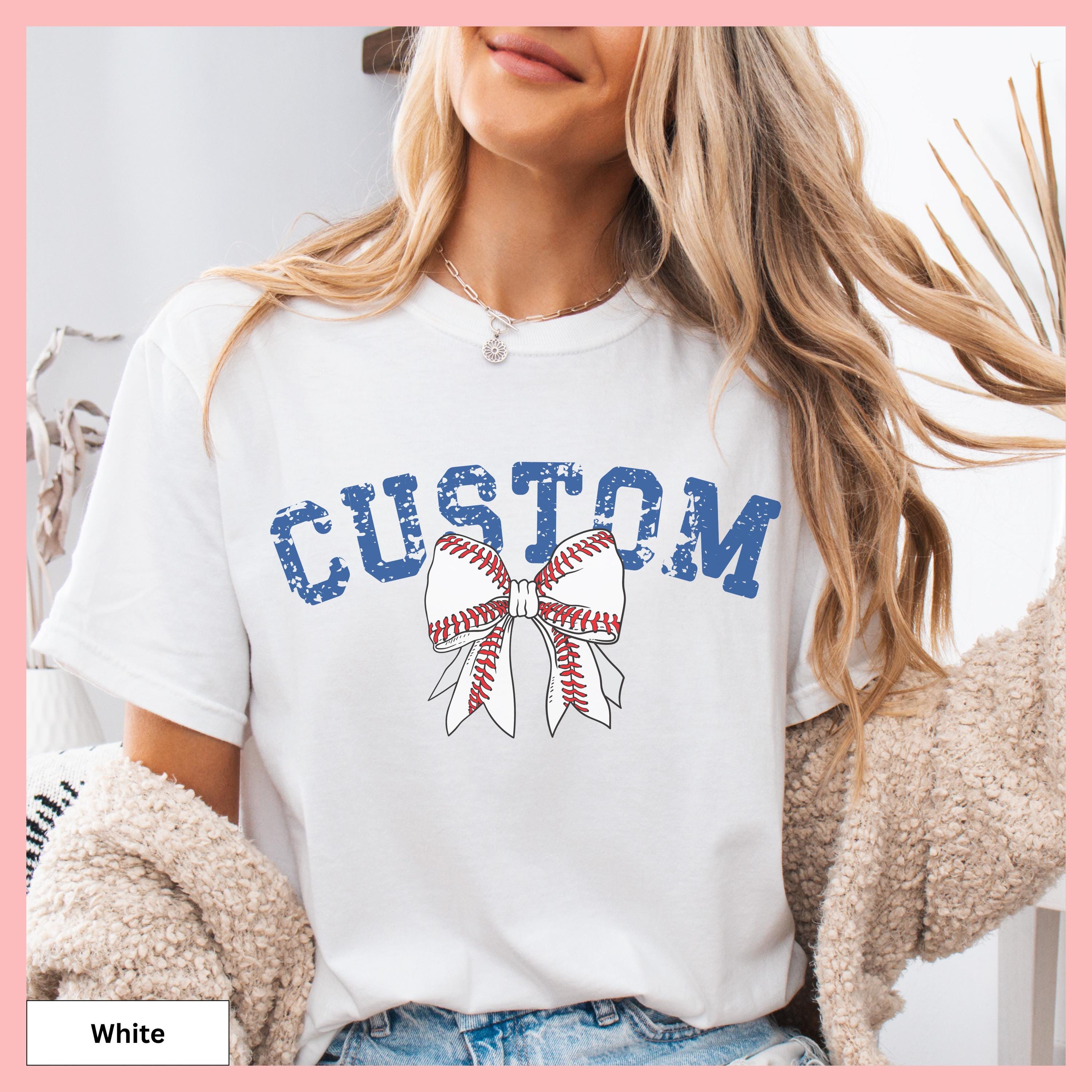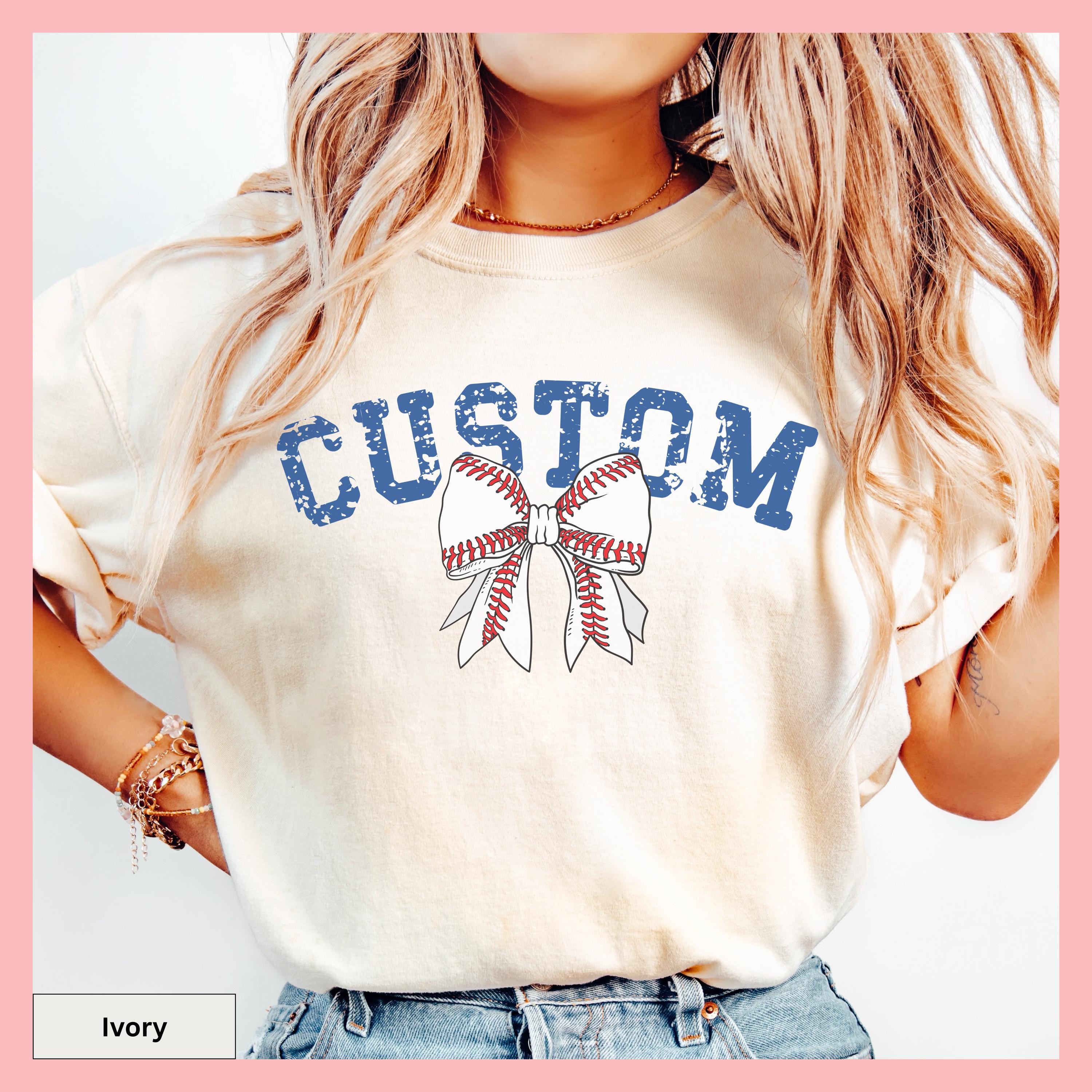 This baseball graphic tshirt features a custom design with distressed text blue lettering and a red stitch bow detail, perfect for the dedicated highschool baseball mom looking for stylish team support apparel. The cream color shirt showcases "CUSTOM" text above a baseball bow graphic with eye-catching red stitching, making it an ideal sport fan item for showing your pride on game day.