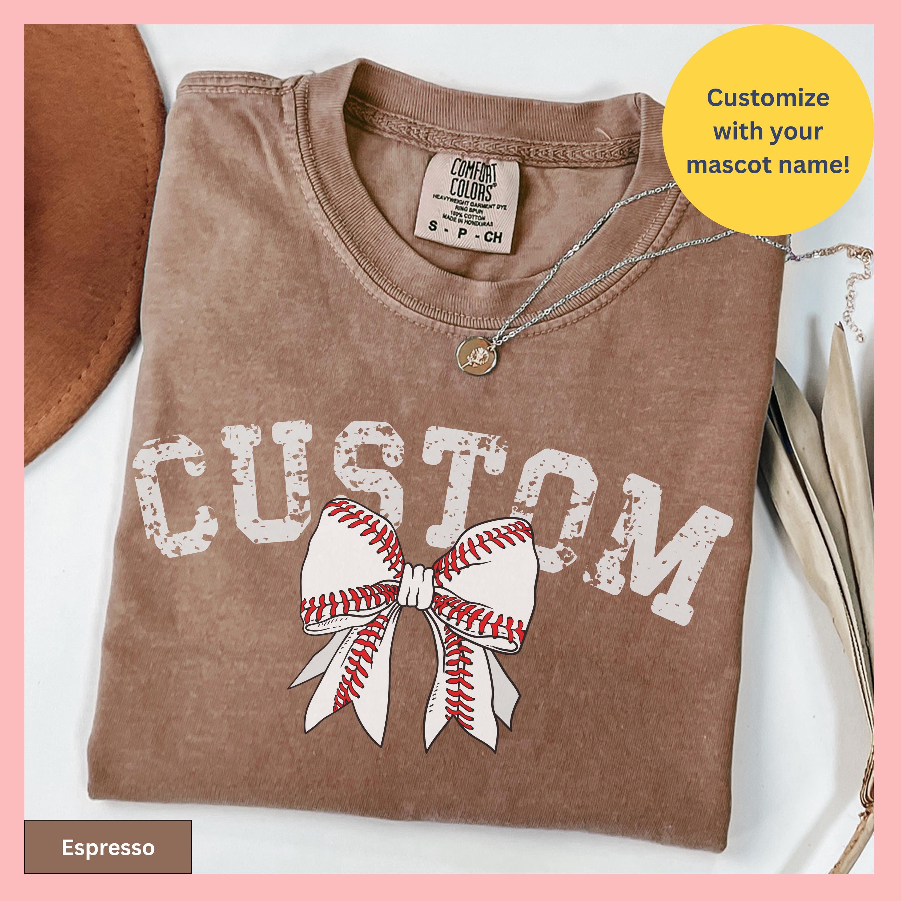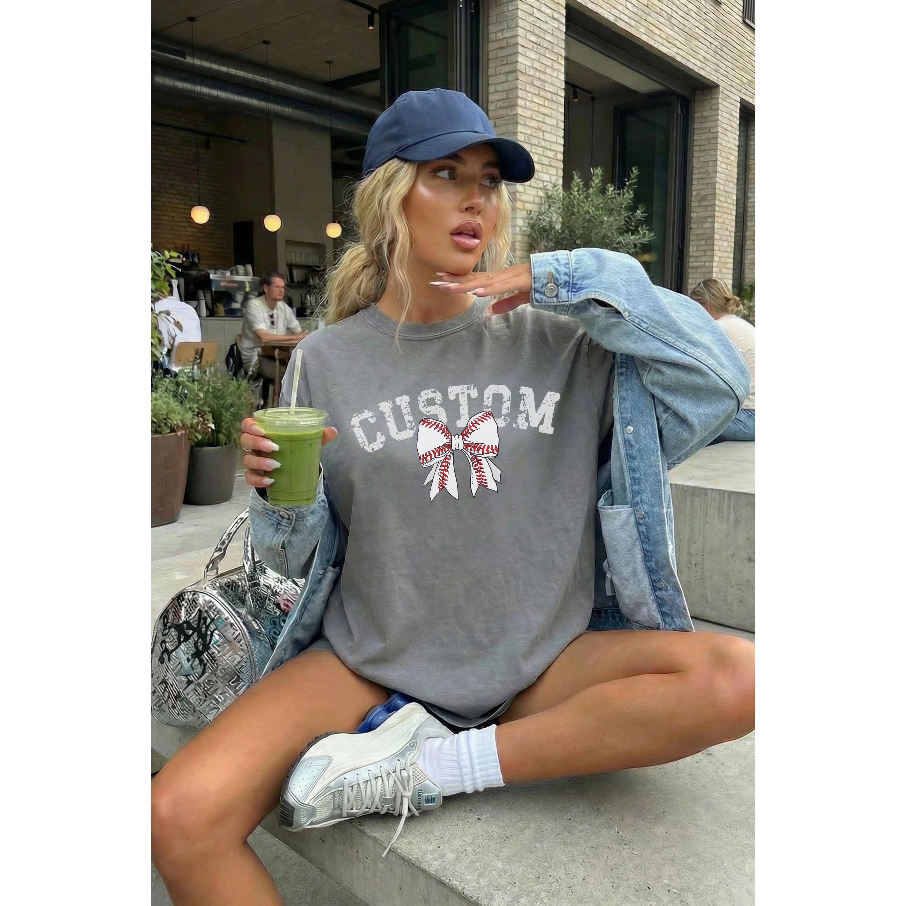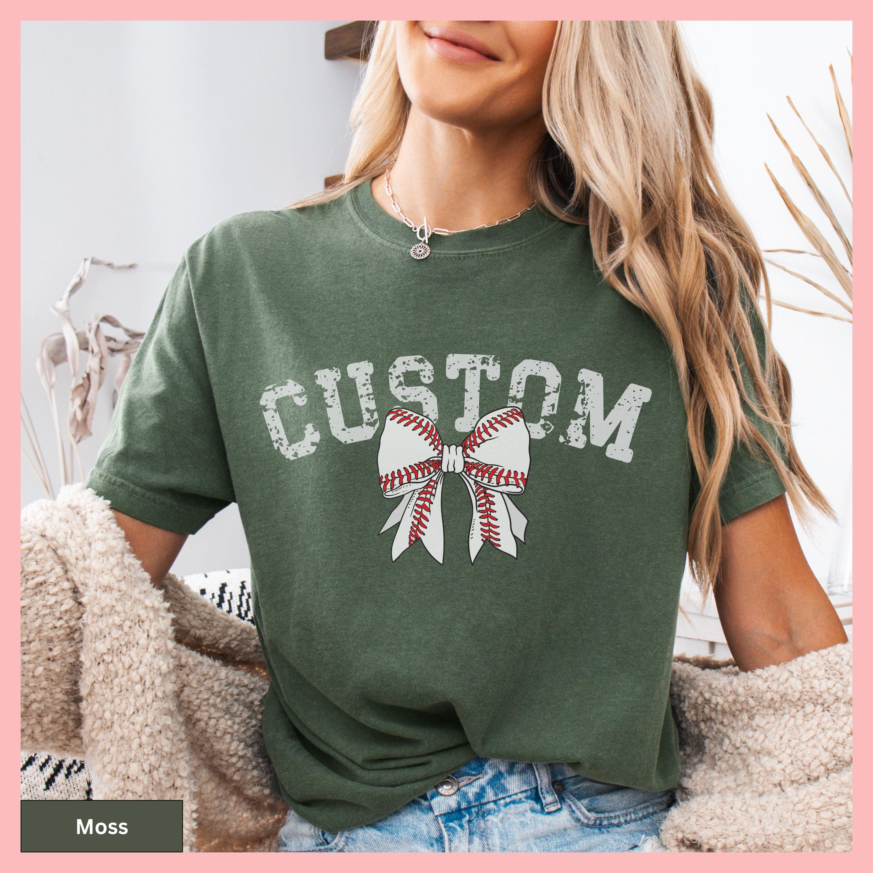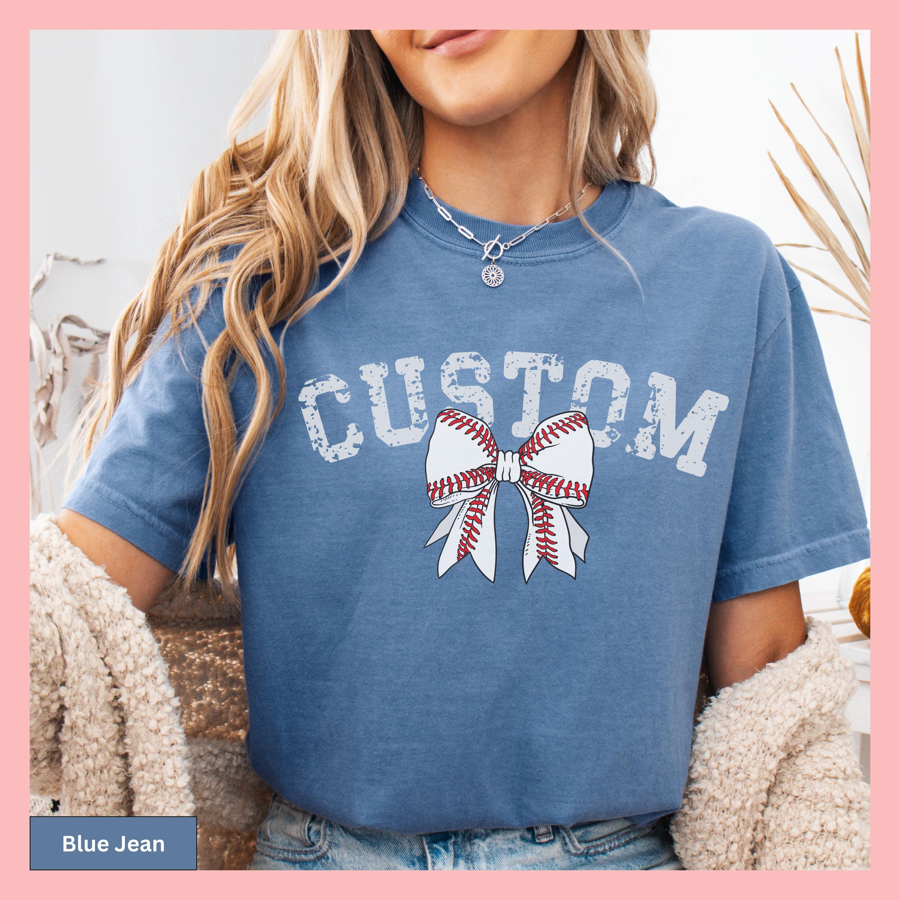 This baseball graphic tshirt features a custom design with distressed text blue lettering and a red stitch bow detail, perfect for the dedicated highschool baseball mom looking for stylish team support apparel. The cream color shirt showcases "CUSTOM" text above a baseball bow graphic with eye-catching red stitching, making it an ideal sport fan item for showing your pride on game day.