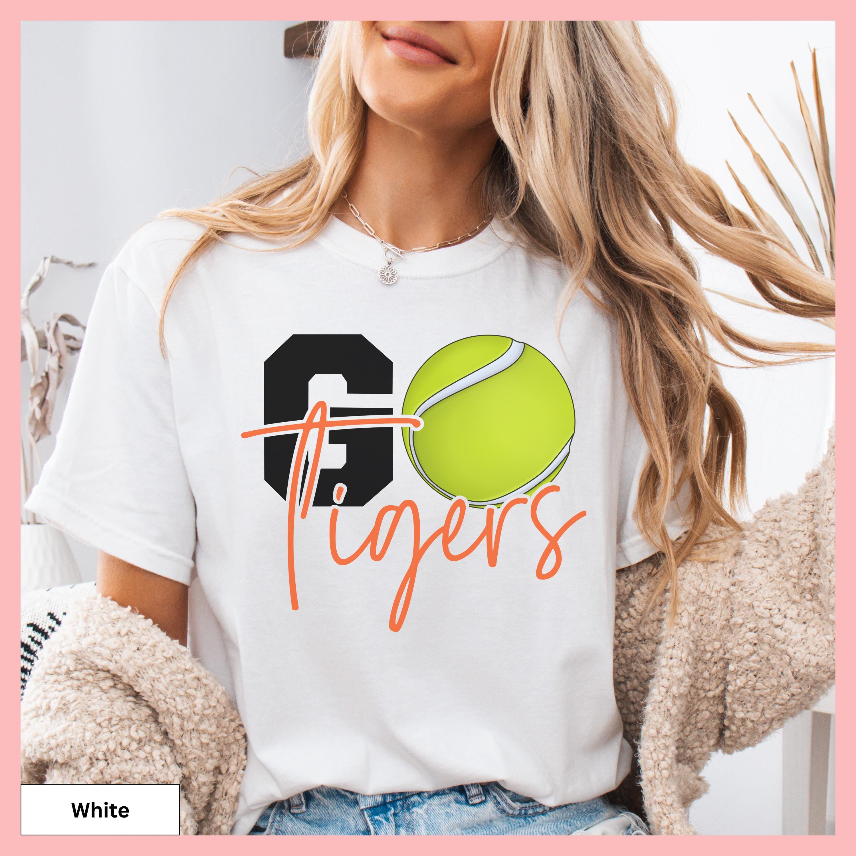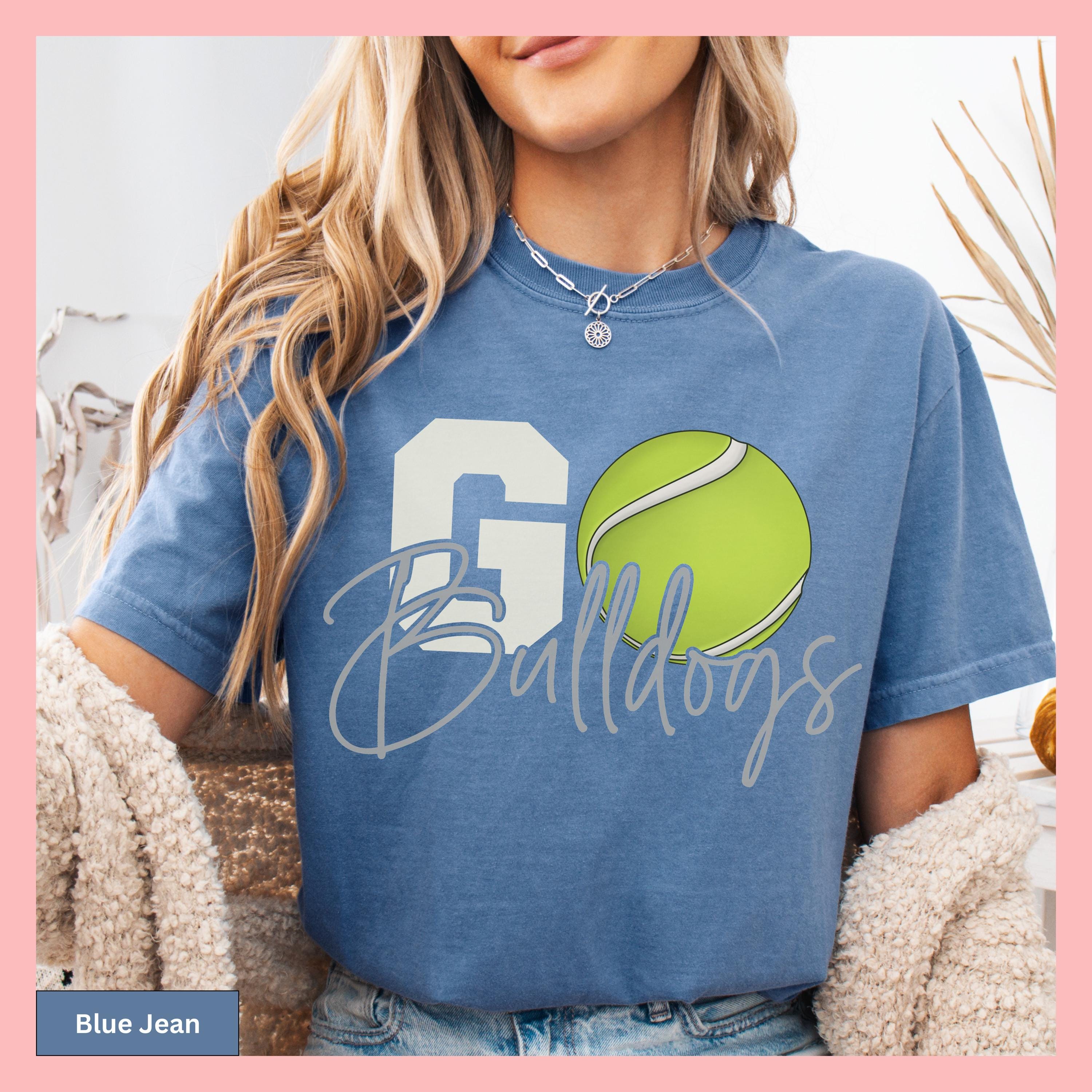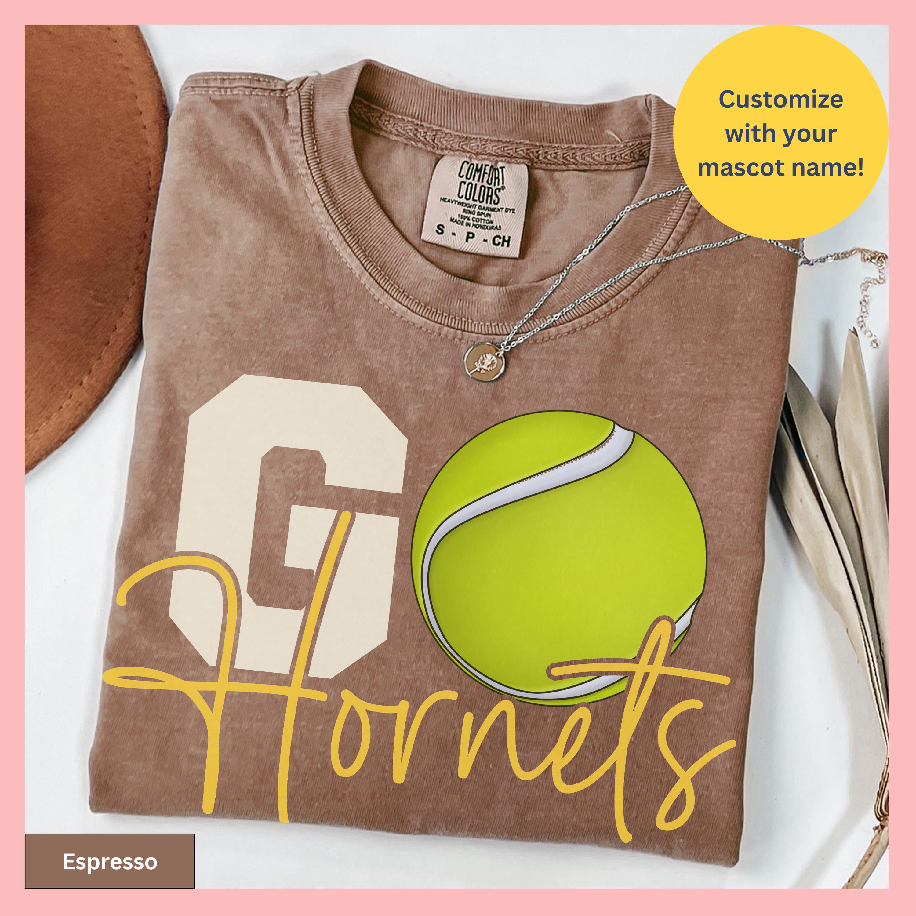 Show your tennis pride with this Comfort Colors Tennis Tee, featuring a personalized tennis tee that makes the perfect gameday gift shirt. This tshirt showcases a distinctive tennis ball graphic to cheer on your tennis team and can be customized with any team or mascot name for that special personal touch.