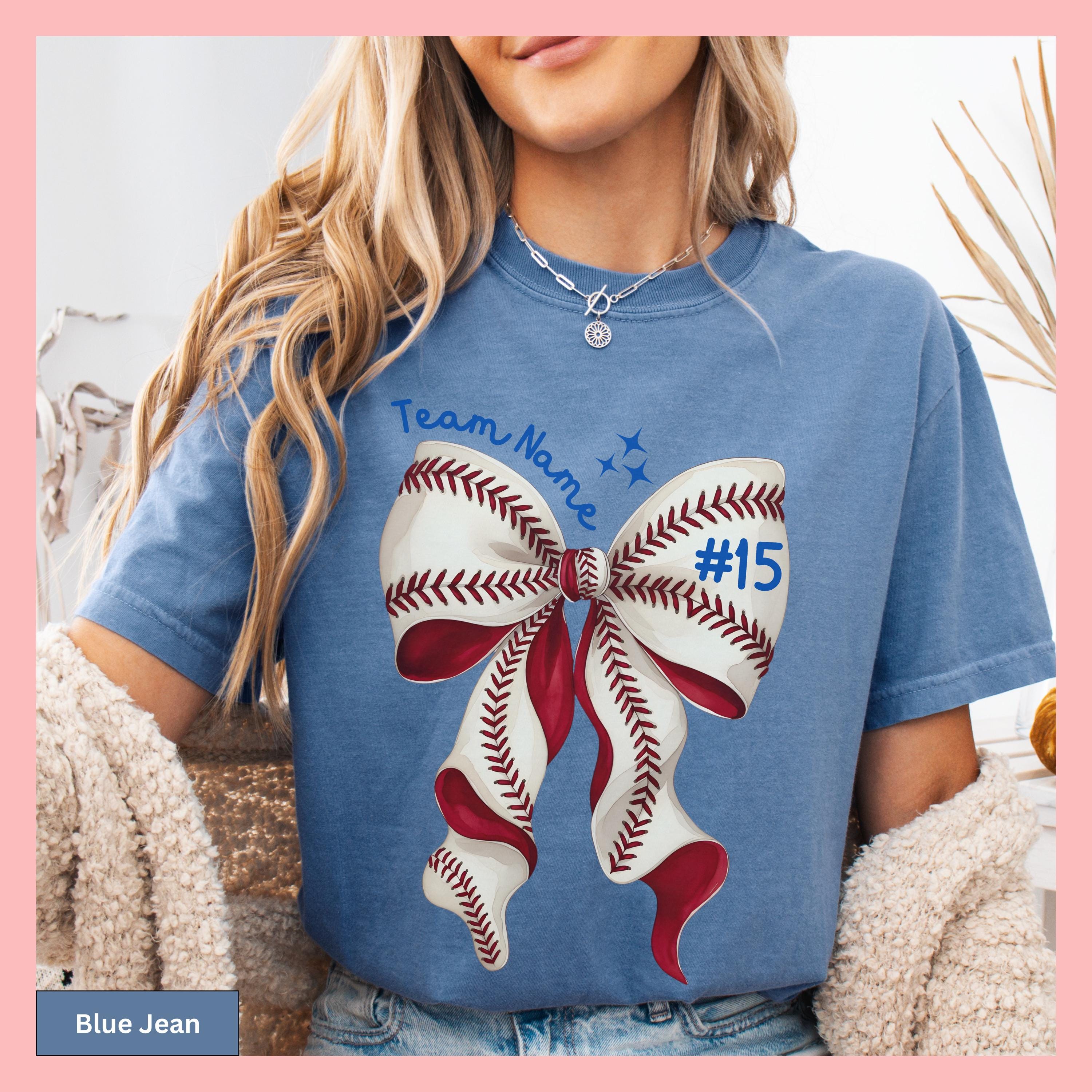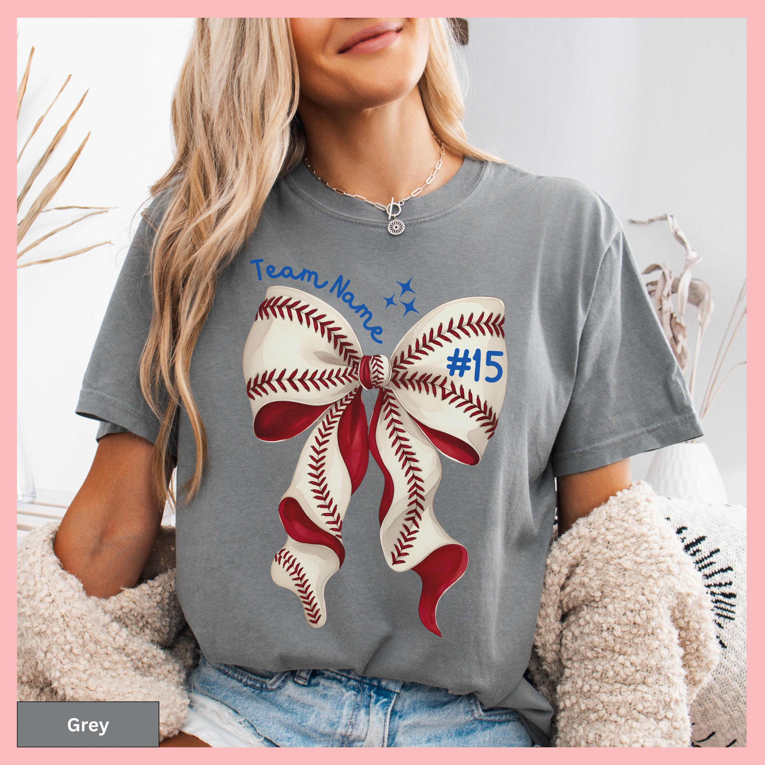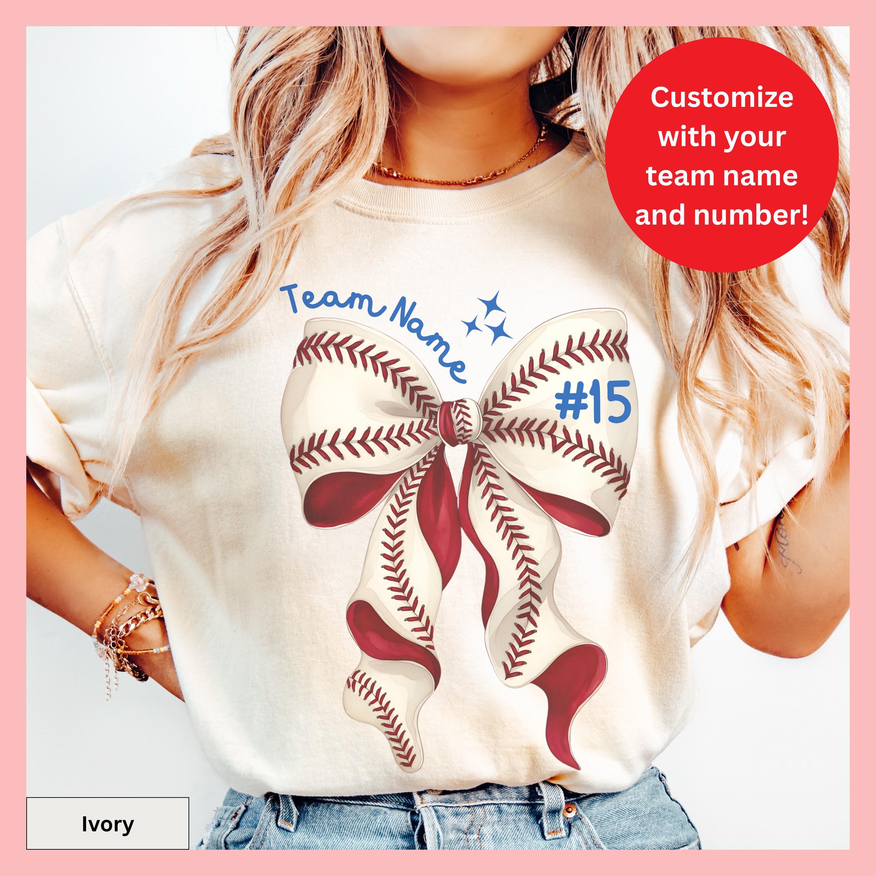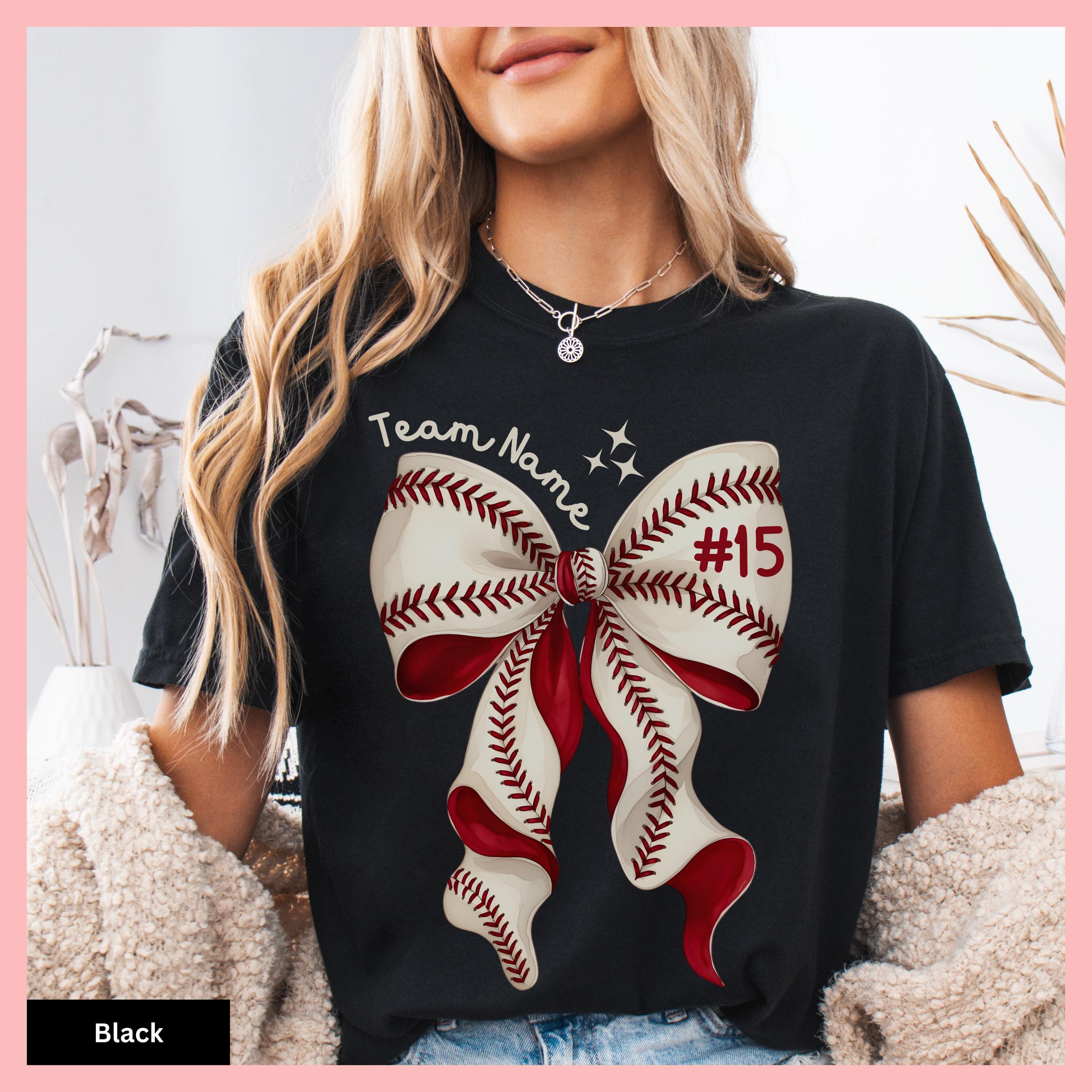 Show your team spirit with our stylish baseball bow shirt, perfect team spirit wear clothing for any baseball mom's outfit or sports girlfriend's wardrobe. This custom tshirt features an eye-catching baseball stitch design that can be personalized with your player's number, making it the ultimate fan apparel gift for game days.