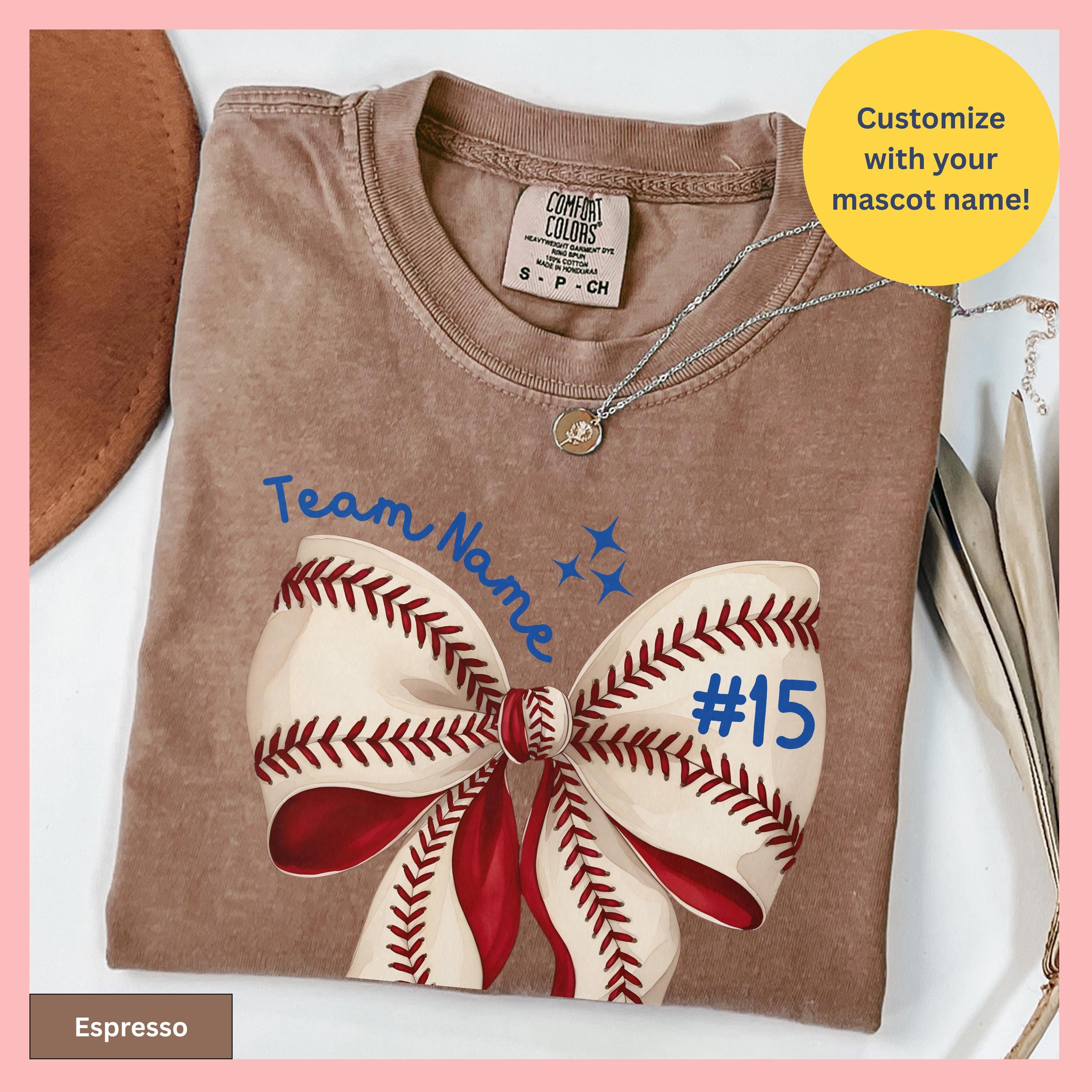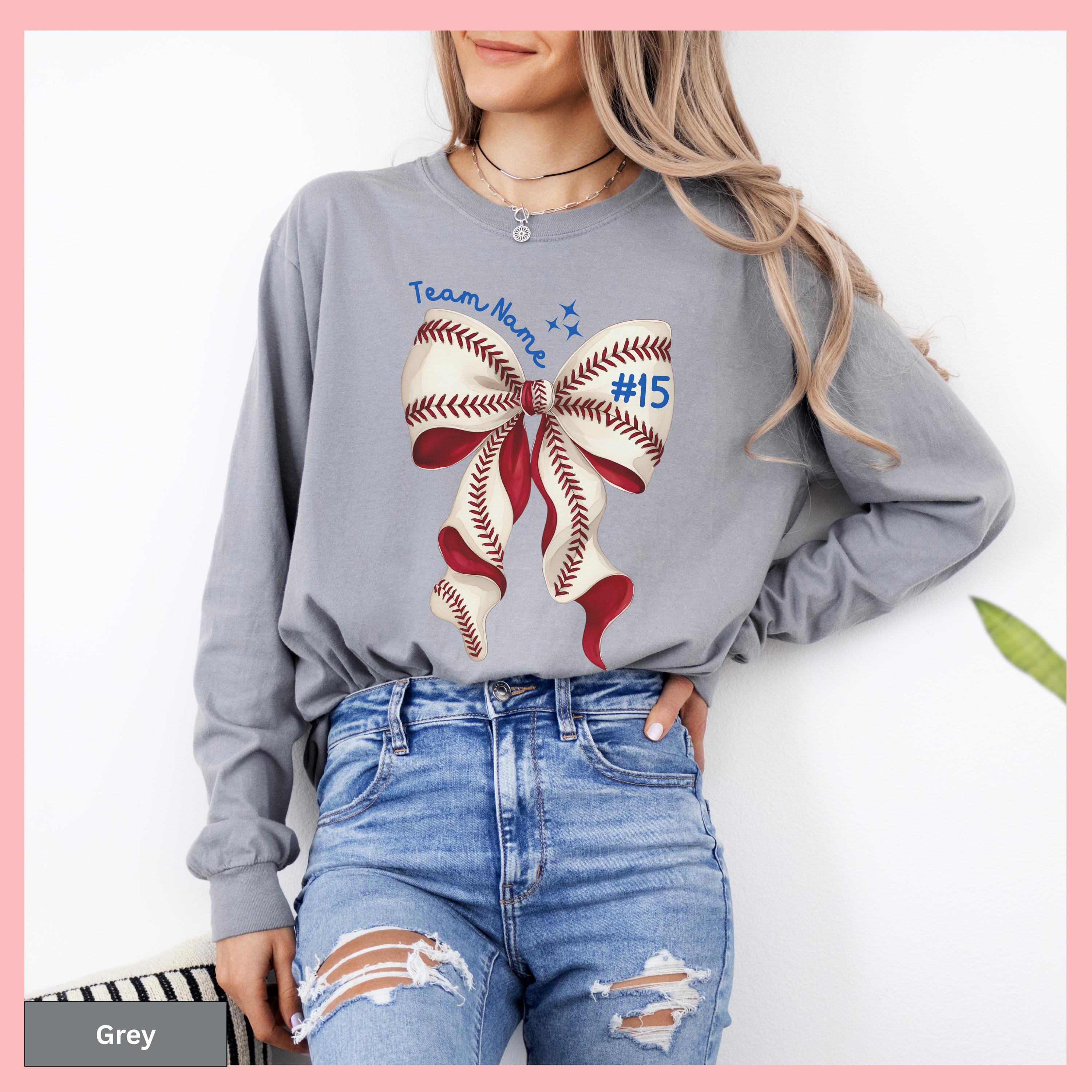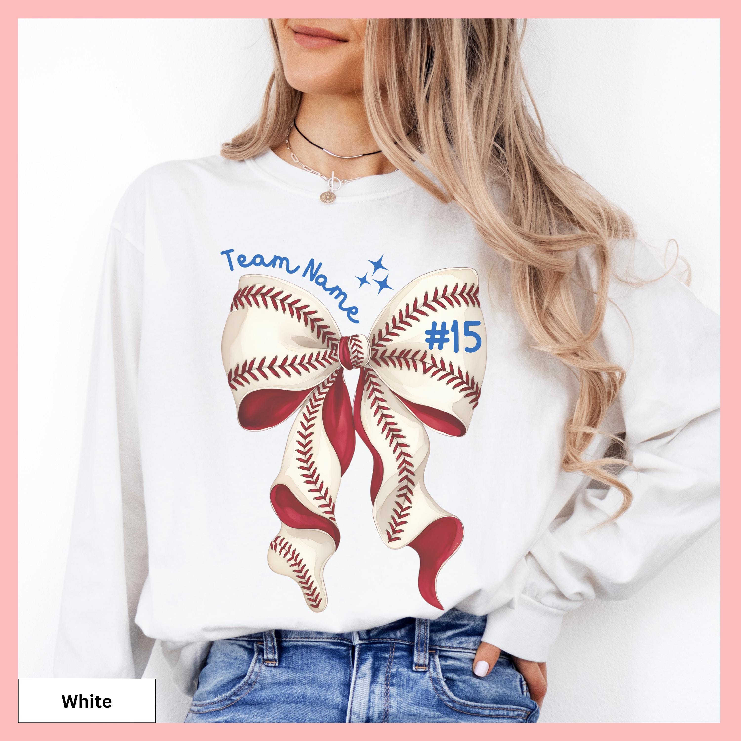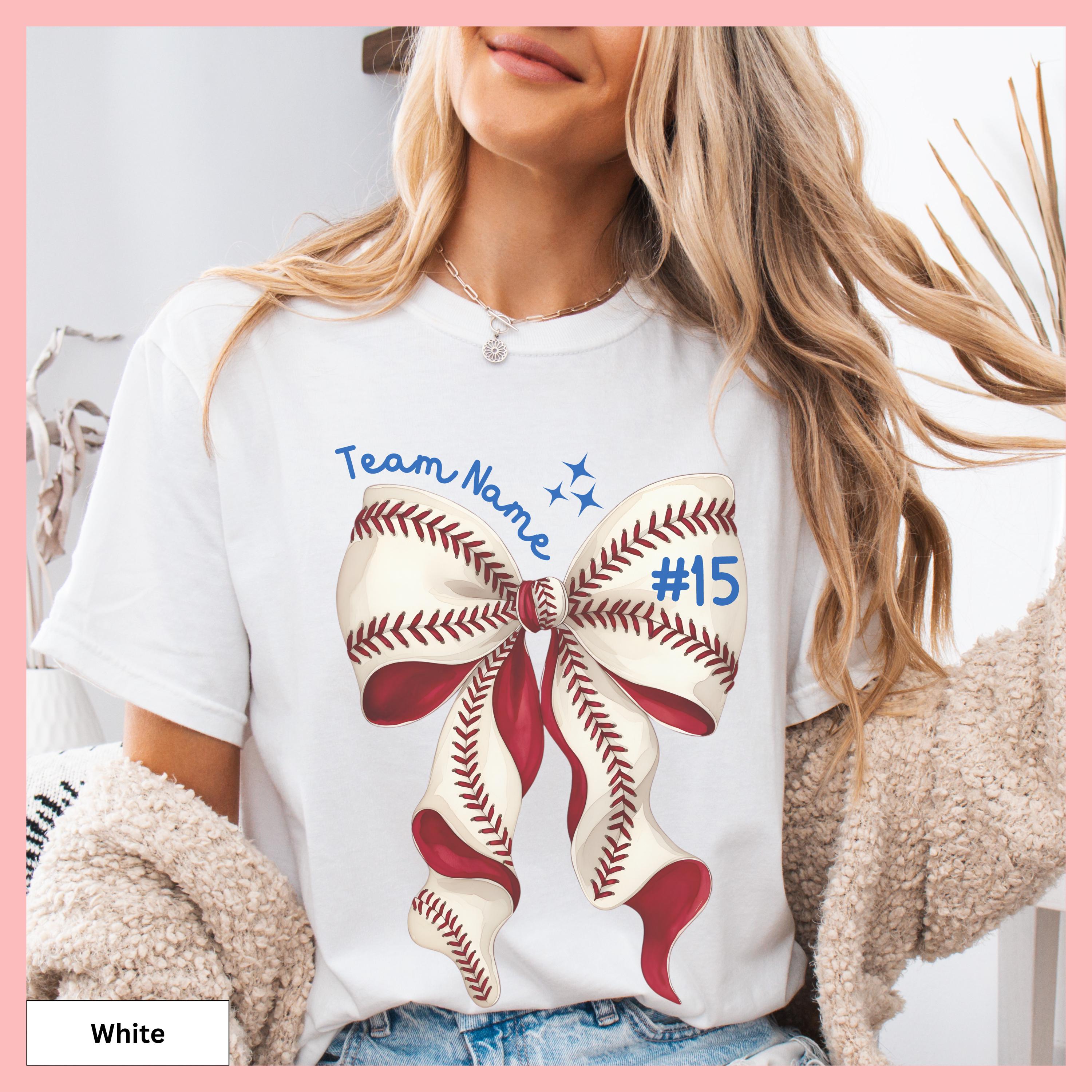 Show your team spirit with our stylish baseball bow shirt, perfect team spirit wear clothing for any baseball mom's outfit or sports girlfriend's wardrobe. This custom tshirt features an eye-catching baseball stitch design that can be personalized with your player's number, making it the ultimate fan apparel gift for game days.